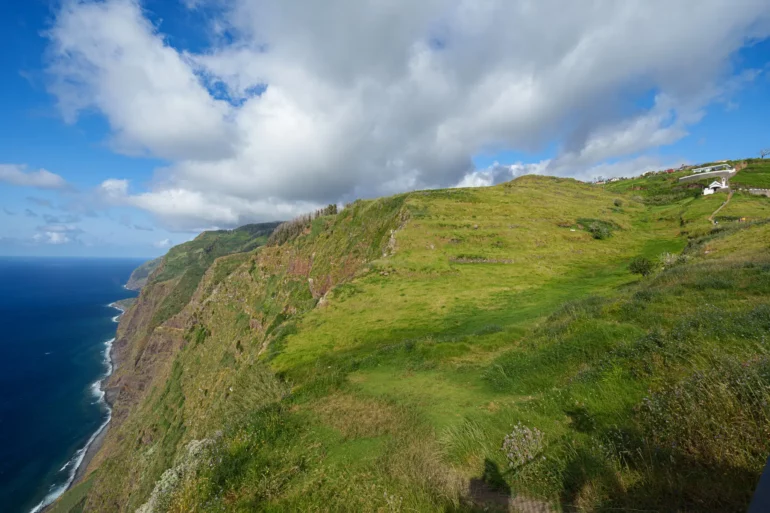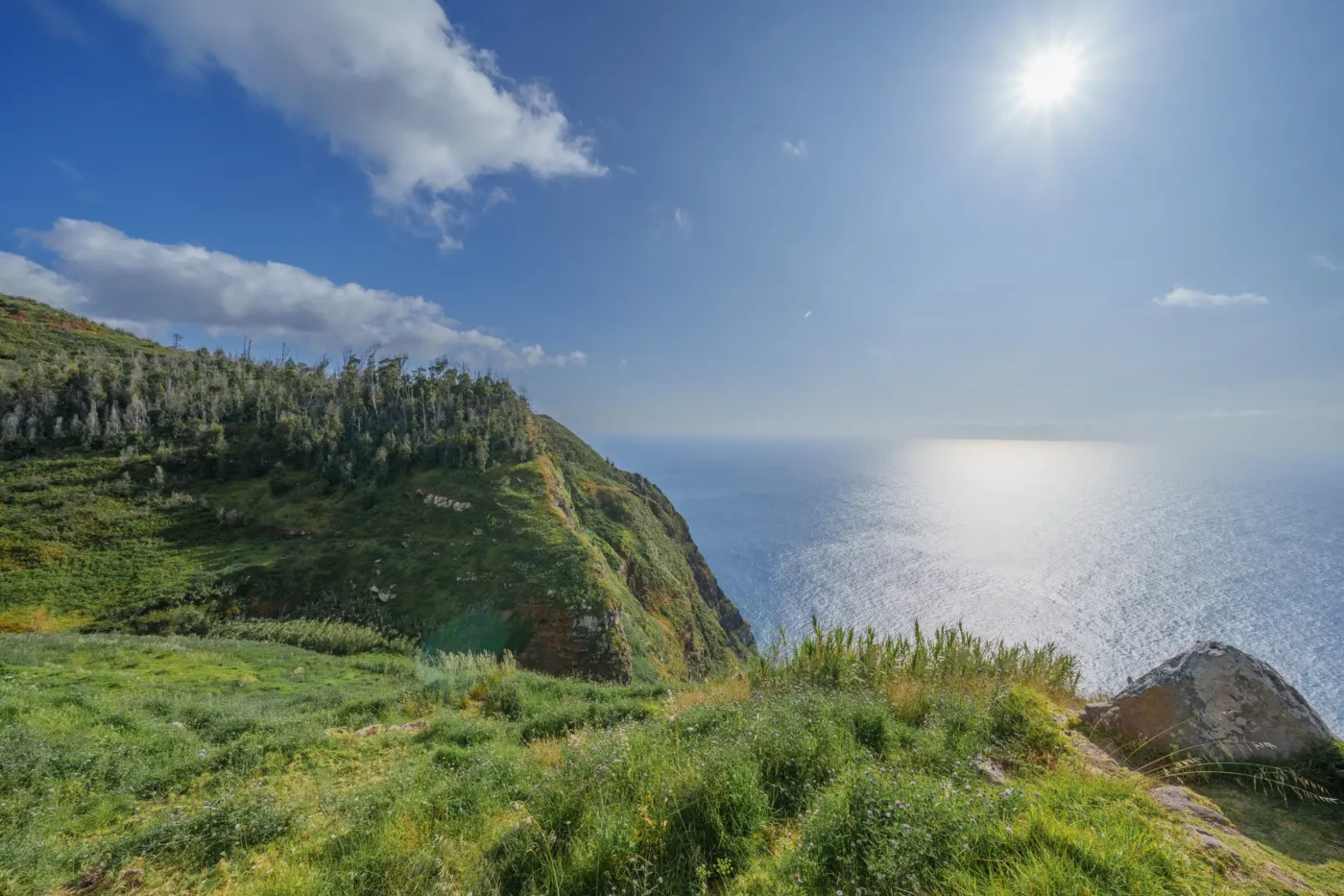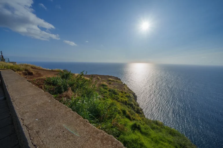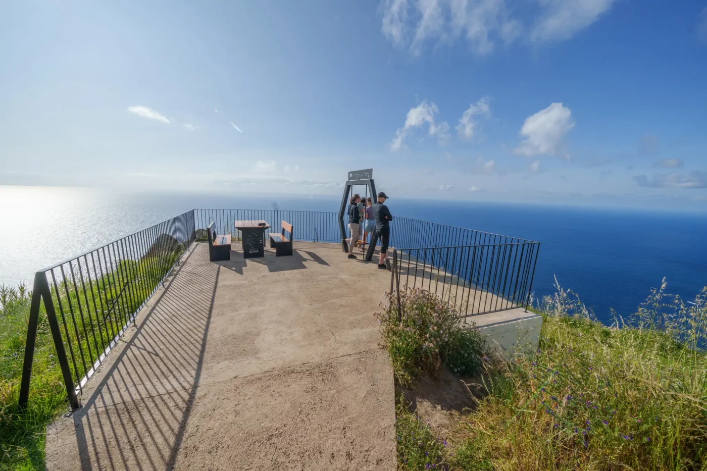 Z tarasu rozciąga się panorama, która jest kwintesencją Madery – z jednej strony soczyście zielone, łagodnie pofalowane wzgórza, a z drugiej dzika, nieokiełznana linia brzegowa i ten sam, niekończący się Atlantyk. To krajobraz pełen kontrastów, który uspokaja i ekscytuje jednocześnie.