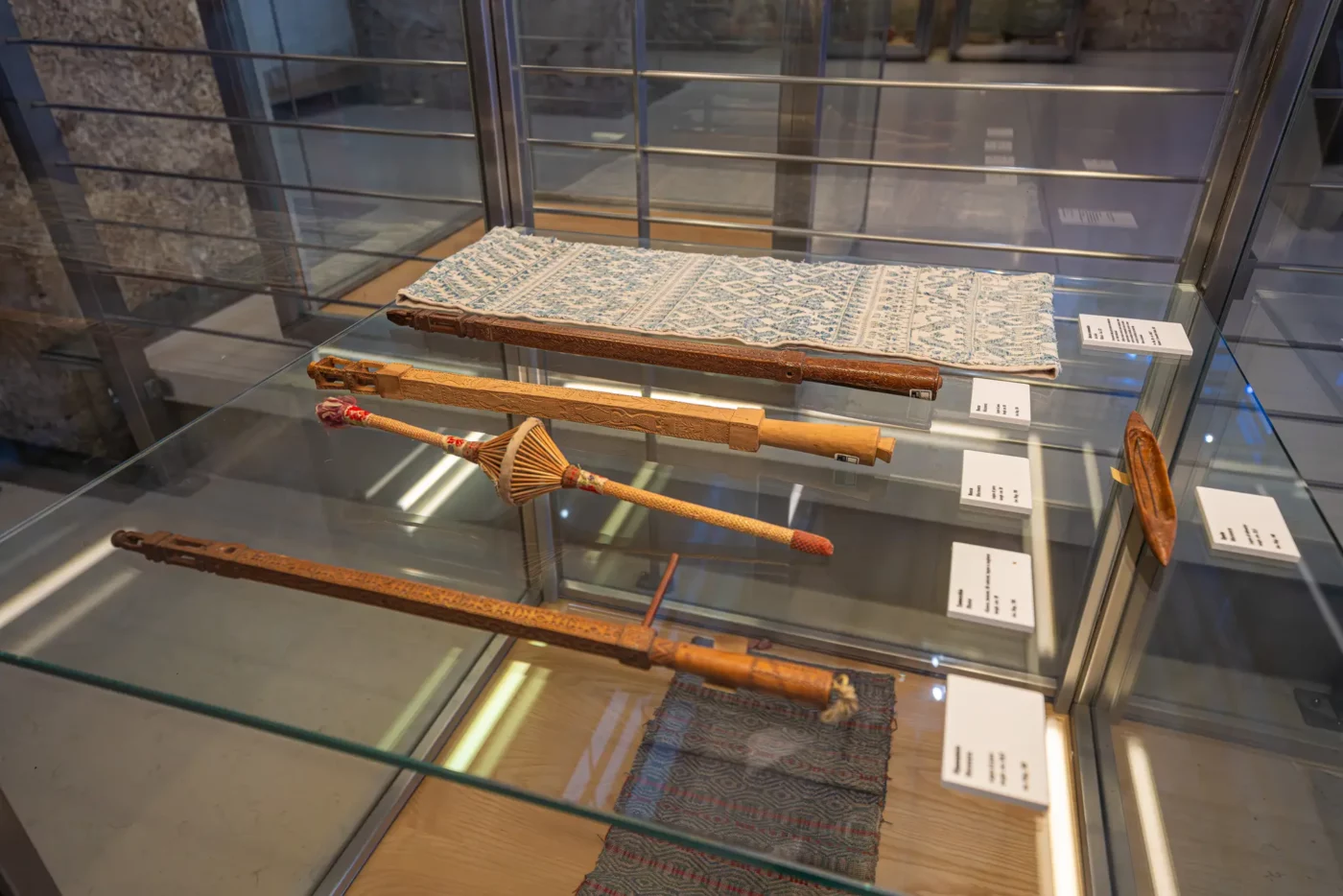 Zaledwie gablotę dalej ten mrok ustępuje miejsca eksplozji barw. Sardyńskie stroje odświętne to majstersztyk rzemiosła: szkarłatne kamizelki, spódnice haftowane złotą nicią i misterne zdobienia. Każdy ścieg i każdy kolor miał tutaj znaczenie, informując o statusie społecznym, pochodzeniu z konkretnej wioski czy stanie cywilnym. To dowód na to, jak bardzo zróżnicowana wewnętrznie jest Sardynia.