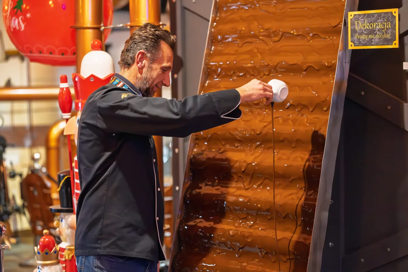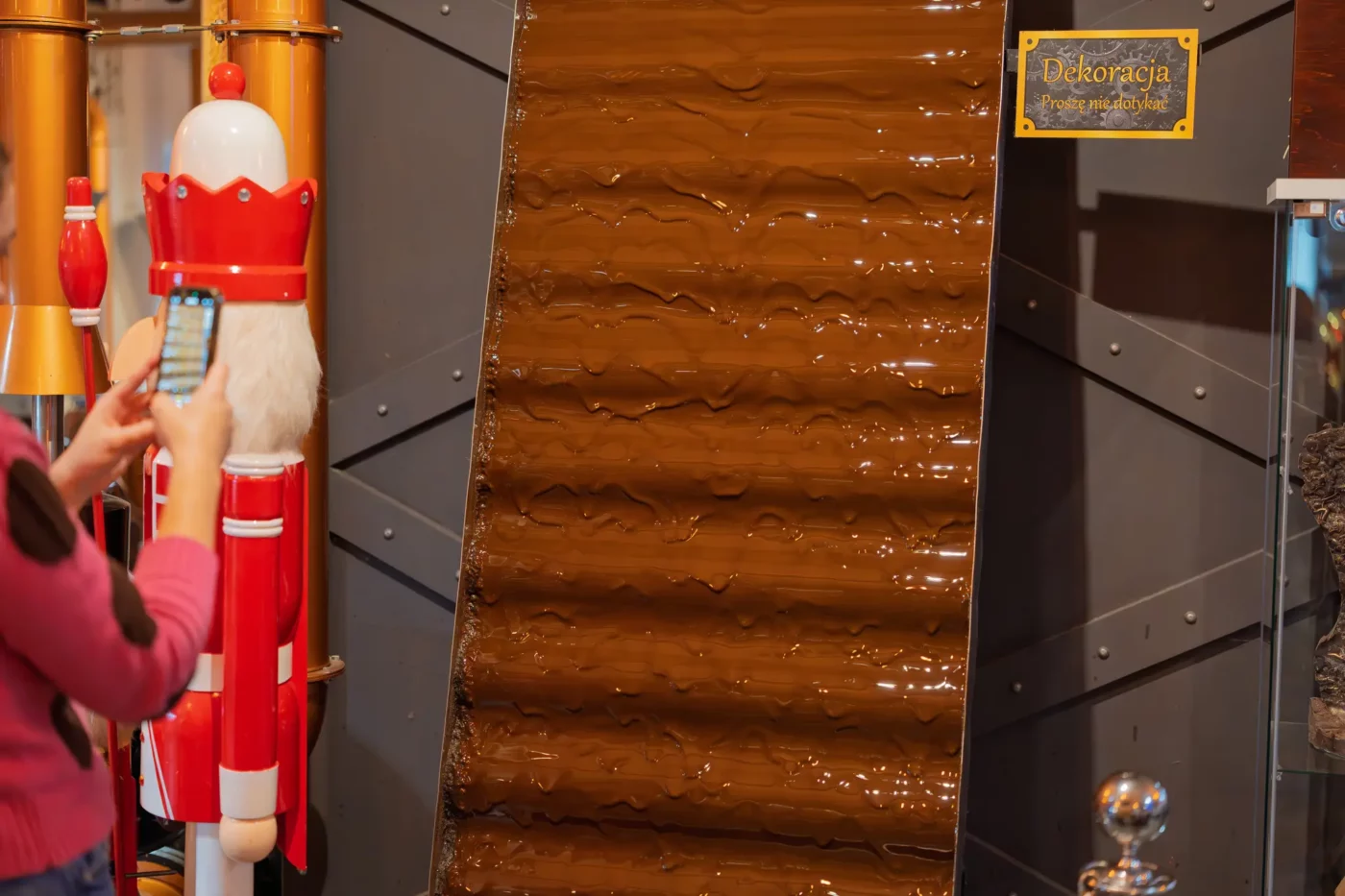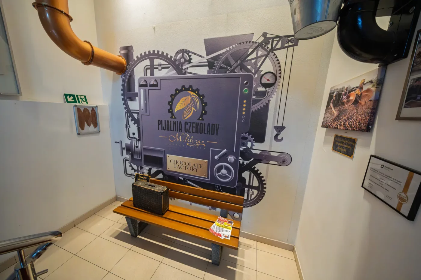 To nie jest kolejny sklep ze słodyczami, a autorski projekt Mirosława Pelczara. Kiedy wchodzimy do środka, od razu rozumiemy, że za tym miejscem stoi człowiek, dla którego cukiernictwo to nie zawód, a obsesja doskonałości. Dwukrotny Mistrz Polski Cukierników stworzył przestrzeń, która jest hołdem dla starej szkoły czekoladnictwa. Wnętrze uderza dopracowaną stylizacją na dawną fabrykę. Pod sufitem biegną rury, którymi symbolicznie transportowana jest płynna czekolada, a centralnym punktem, który hipnotyzuje każdego gościa, jest potężna fontanna czekolady. Jednak dla nas, jako redakcji szukającej autentyczności, najważniejsza jest transparentność. Przeszklona ściana produkcji pozwala podglądać mistrzów przy pracy – widok temperowania czekolady i ręcznego formowania pralin to spektakl, który moglibyśmy oglądać godzinami.