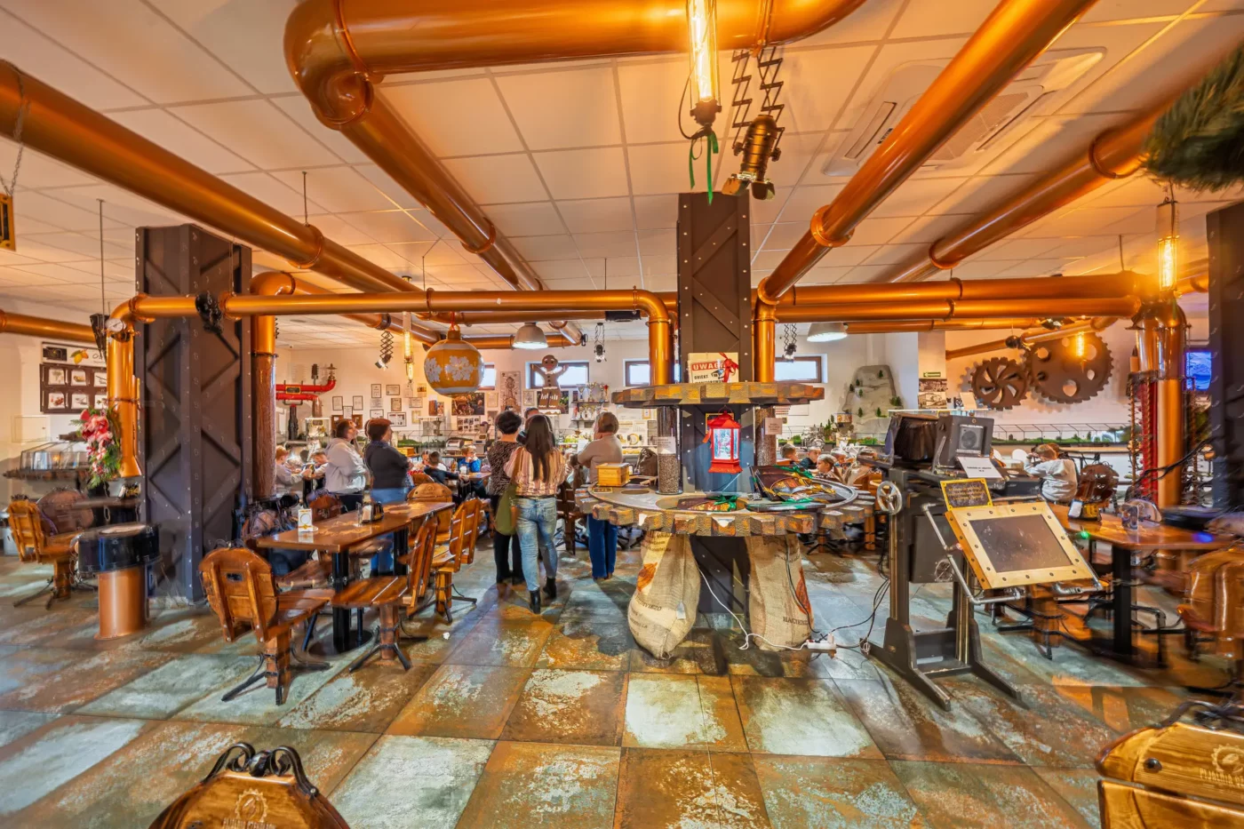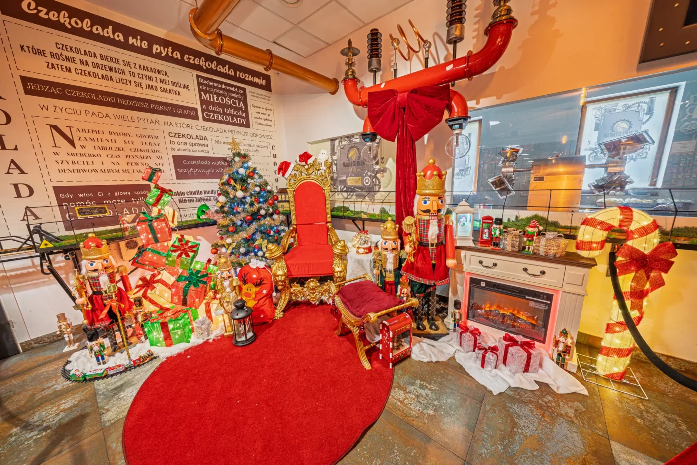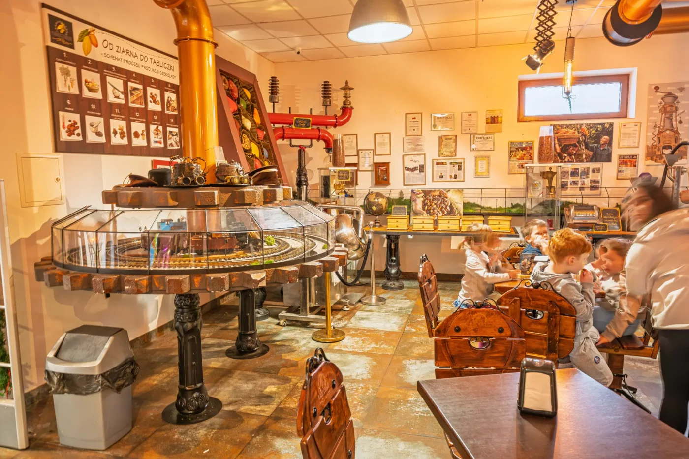 To nie jest kolejny sklep ze słodyczami, a autorski projekt Mirosława Pelczara. Kiedy wchodzimy do środka, od razu rozumiemy, że za tym miejscem stoi człowiek, dla którego cukiernictwo to nie zawód, a obsesja doskonałości. Dwukrotny Mistrz Polski Cukierników stworzył przestrzeń, która jest hołdem dla starej szkoły czekoladnictwa. Wnętrze uderza dopracowaną stylizacją na dawną fabrykę. Pod sufitem biegną rury, którymi symbolicznie transportowana jest płynna czekolada, a centralnym punktem, który hipnotyzuje każdego gościa, jest potężna fontanna czekolady. Jednak dla nas, jako redakcji szukającej autentyczności, najważniejsza jest transparentność. Przeszklona ściana produkcji pozwala podglądać mistrzów przy pracy – widok temperowania czekolady i ręcznego formowania pralin to spektakl, który moglibyśmy oglądać godzinami.