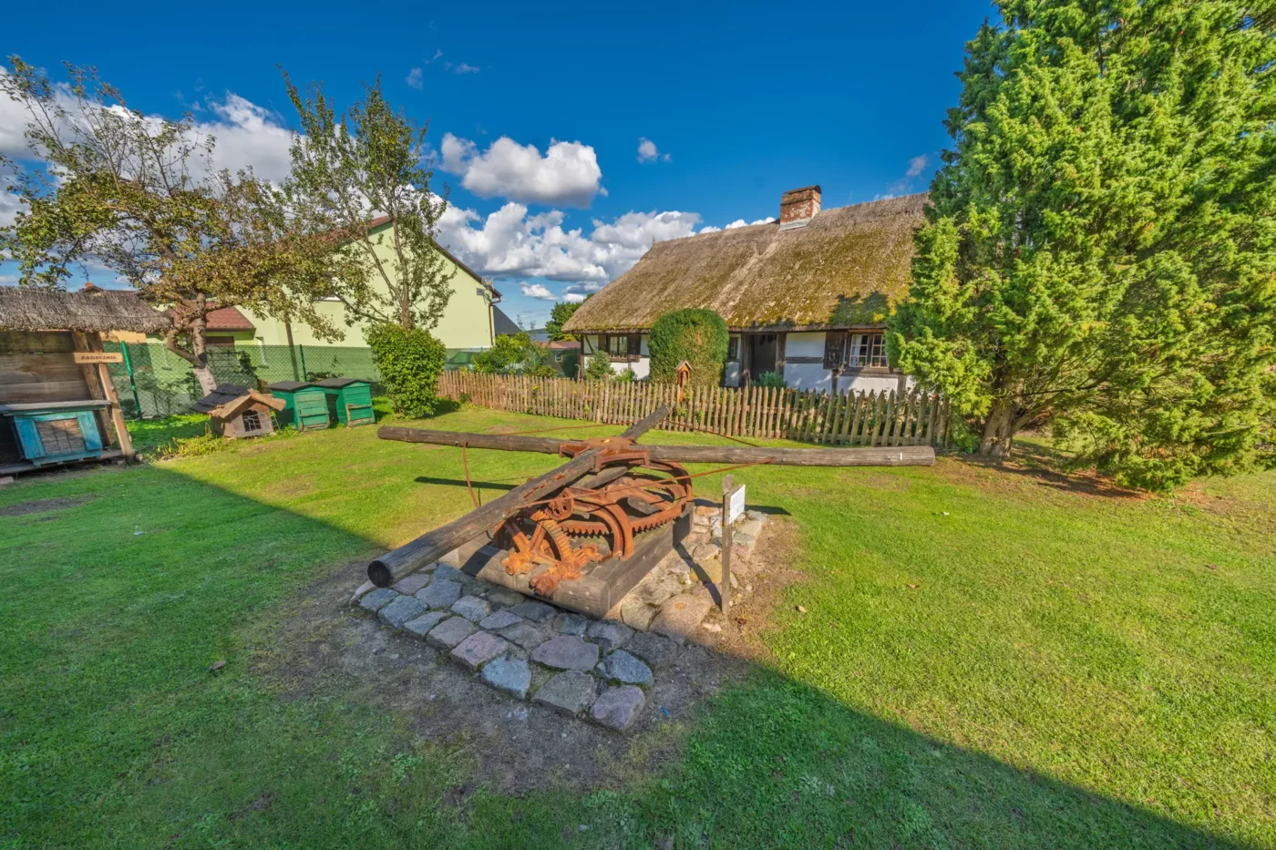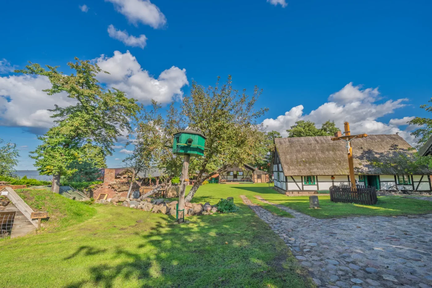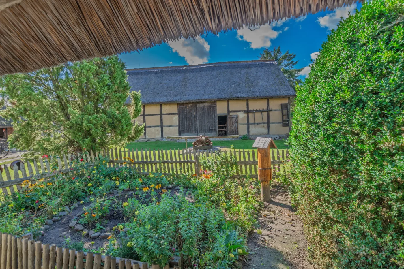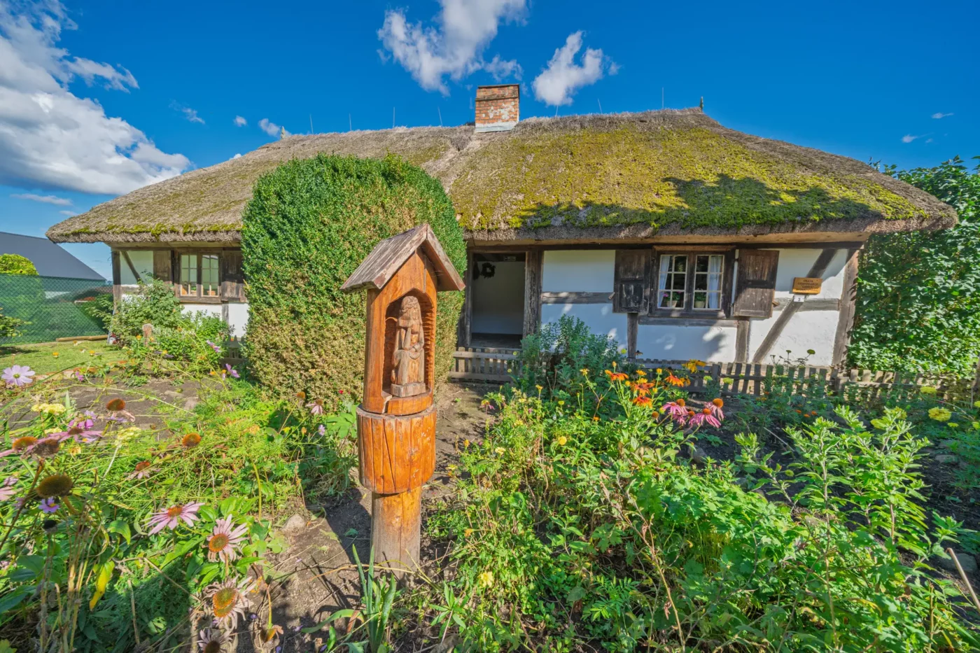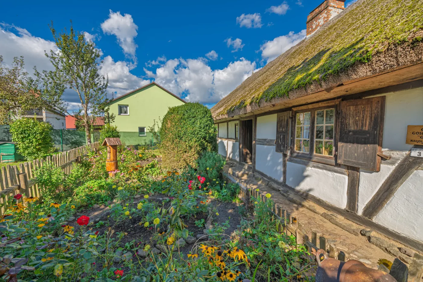 Przekraczając próg tego skansenu, ma się wrażenie, że jego mieszkańcy wyszli tylko na chwilę. W sercu zagrody stoi checz – solidny, tradycyjny dom zamożnego kaszubskiego gospodarza. To tutaj biło serce całego gospodarstwa. Wnętrze, z potężnym piecem chlebowym i prostymi, lecz solidnymi meblami, opowiada historię rodziny, pracy i wspólnoty. Wokół domu rozlokowano pozostałe zabudowania: oborę, stodołę pachnącą sianem, wozownię i kamienną piwniczkę. Pomiędzy nimi rozkwita ogród, pełen zapomnianych dziś ziół, kolorowych kwiatów i warzyw, które stanowiły podstawę codziennej diety.