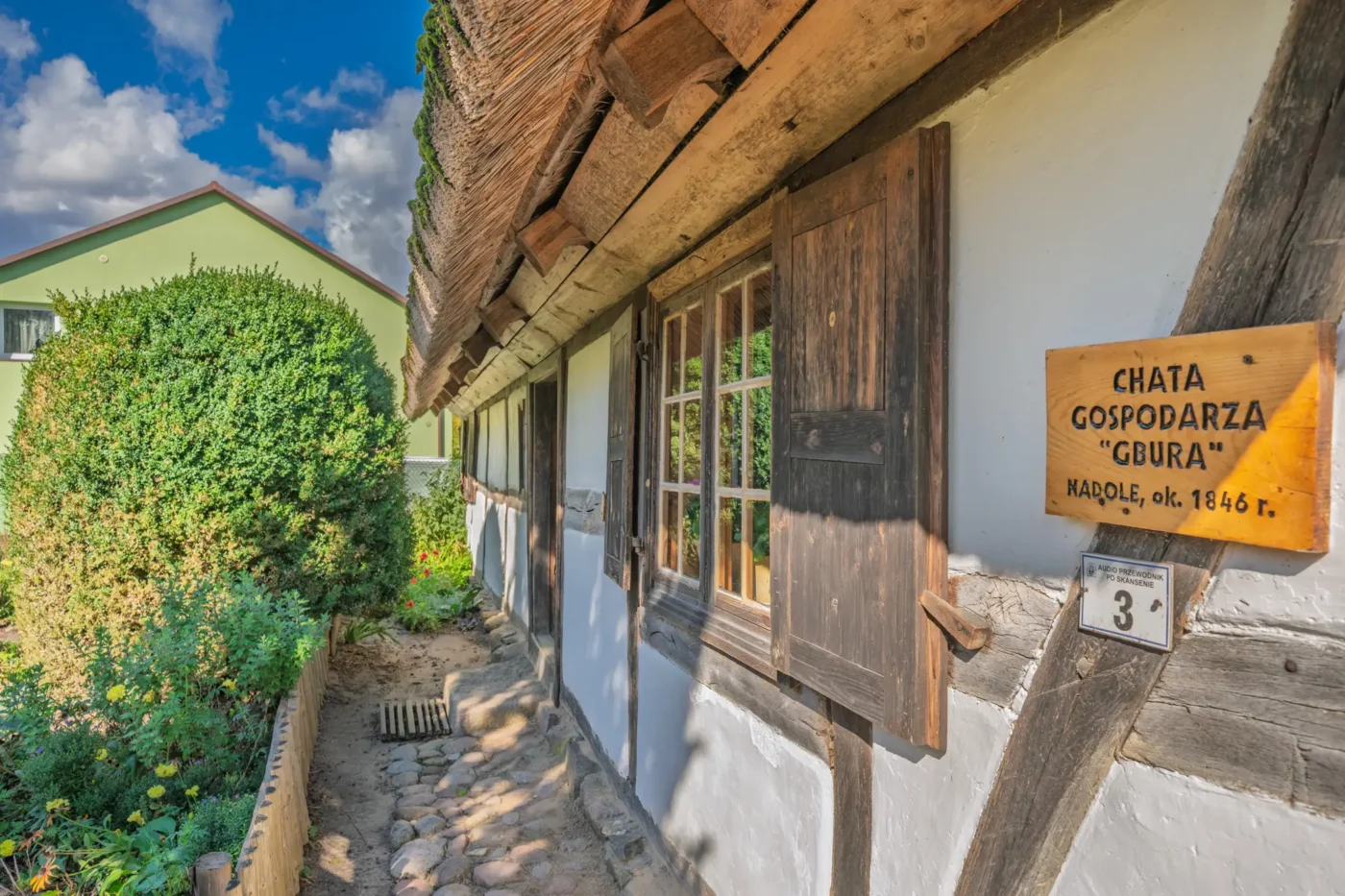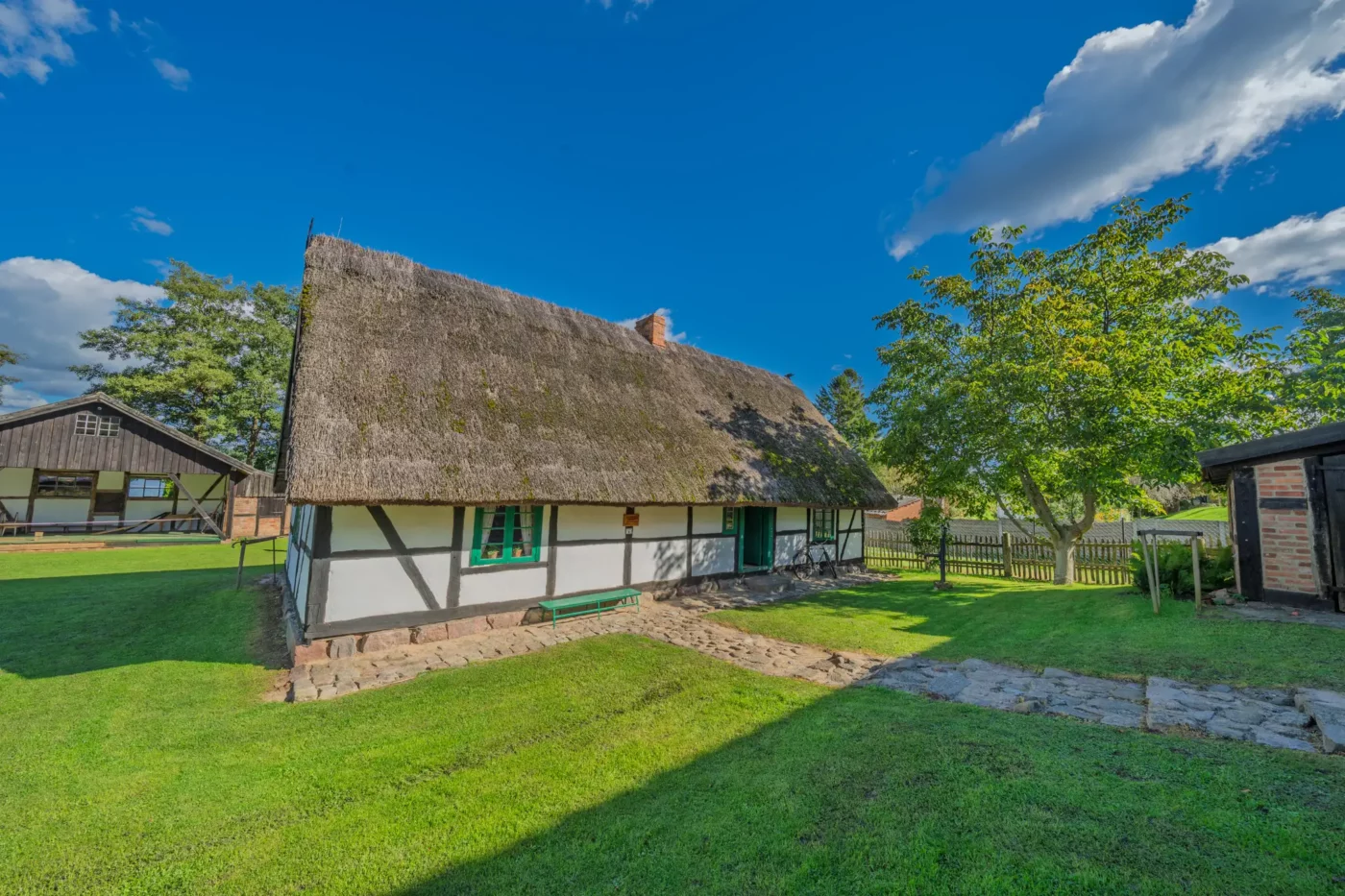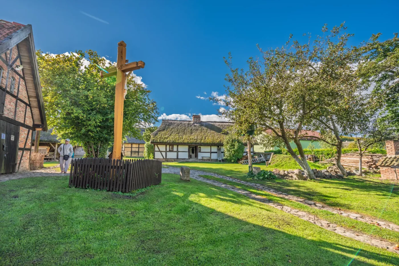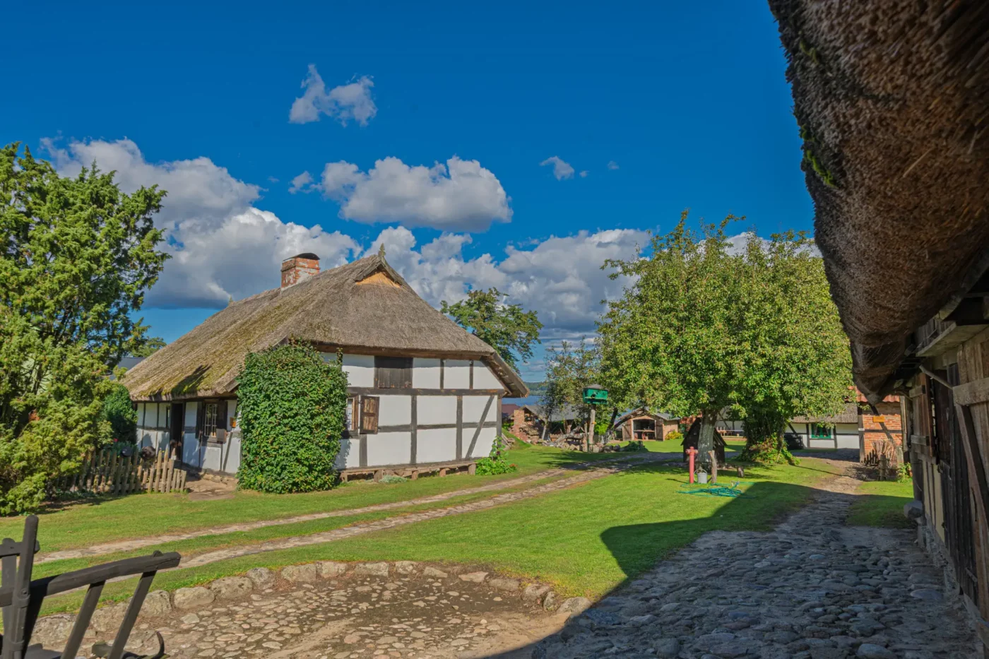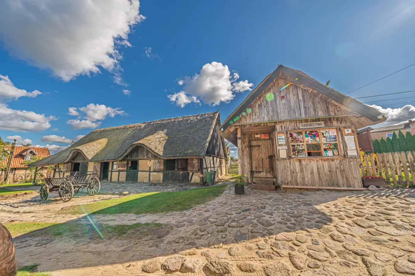 Przekraczając próg tego skansenu, ma się wrażenie, że jego mieszkańcy wyszli tylko na chwilę. W sercu zagrody stoi checz – solidny, tradycyjny dom zamożnego kaszubskiego gospodarza. To tutaj biło serce całego gospodarstwa. Wnętrze, z potężnym piecem chlebowym i prostymi, lecz solidnymi meblami, opowiada historię rodziny, pracy i wspólnoty. Wokół domu rozlokowano pozostałe zabudowania: oborę, stodołę pachnącą sianem, wozownię i kamienną piwniczkę. Pomiędzy nimi rozkwita ogród, pełen zapomnianych dziś ziół, kolorowych kwiatów i warzyw, które stanowiły podstawę codziennej diety.