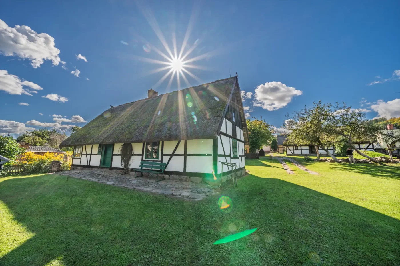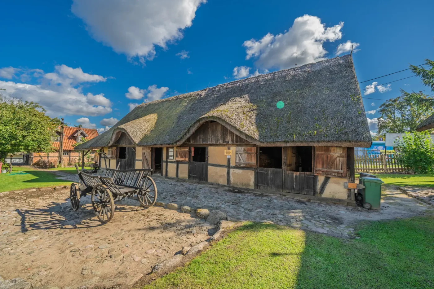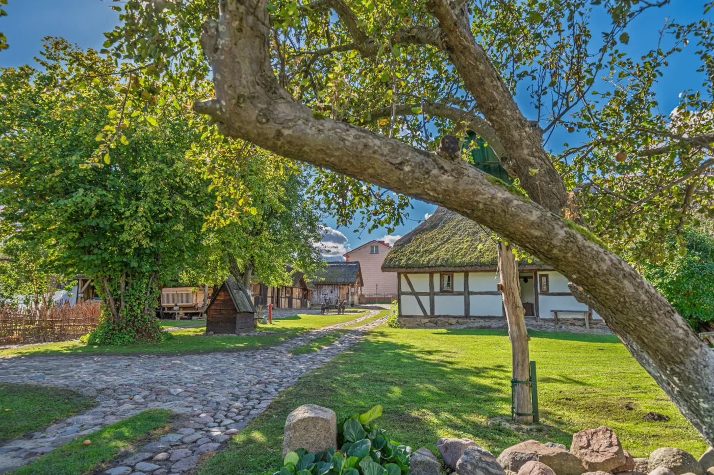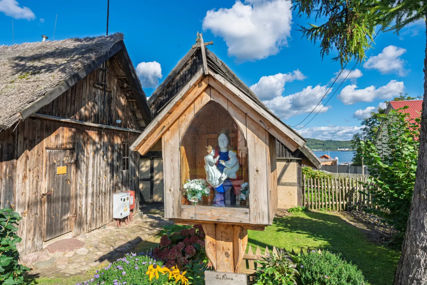 Przekraczając próg tego skansenu, ma się wrażenie, że jego mieszkańcy wyszli tylko na chwilę. W sercu zagrody stoi checz – solidny, tradycyjny dom zamożnego kaszubskiego gospodarza. To tutaj biło serce całego gospodarstwa. Wnętrze, z potężnym piecem chlebowym i prostymi, lecz solidnymi meblami, opowiada historię rodziny, pracy i wspólnoty. Wokół domu rozlokowano pozostałe zabudowania: oborę, stodołę pachnącą sianem, wozownię i kamienną piwniczkę. Pomiędzy nimi rozkwita ogród, pełen zapomnianych dziś ziół, kolorowych kwiatów i warzyw, które stanowiły podstawę codziennej diety.