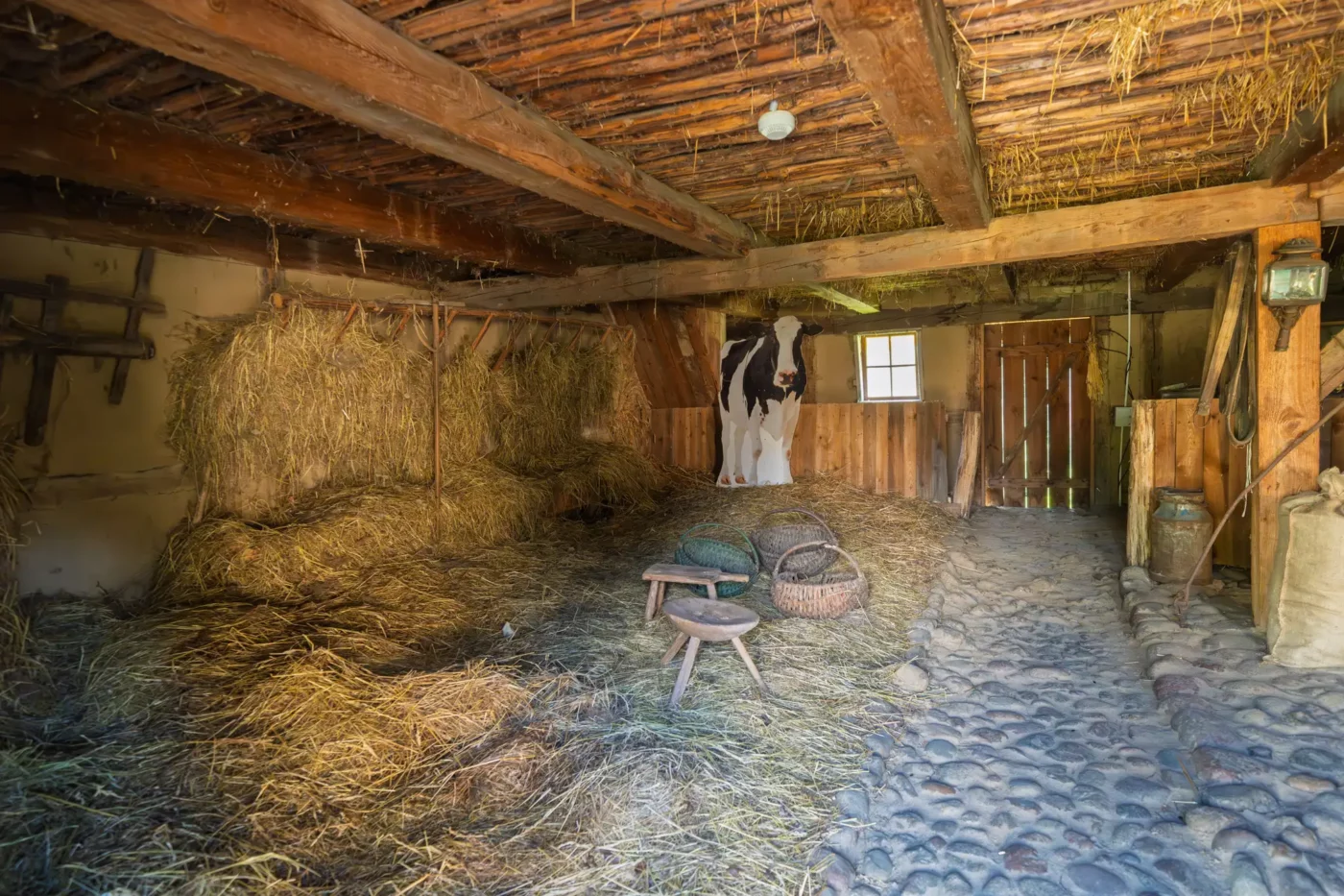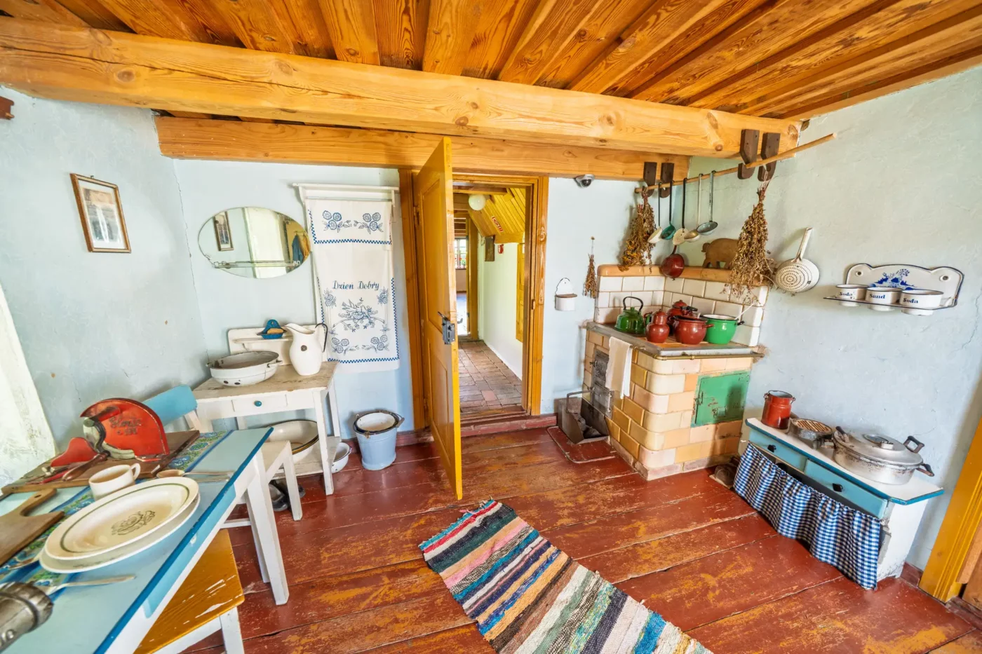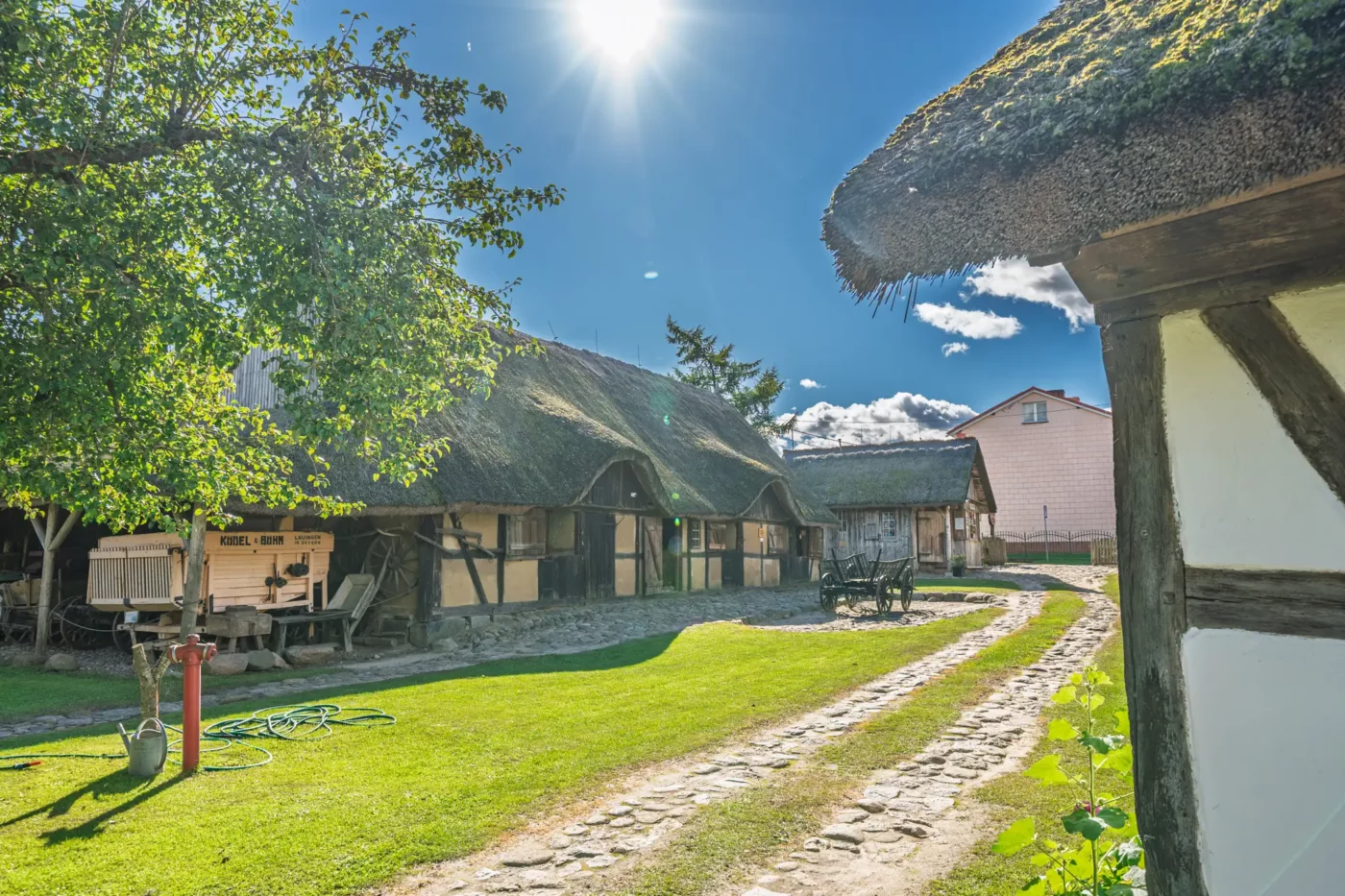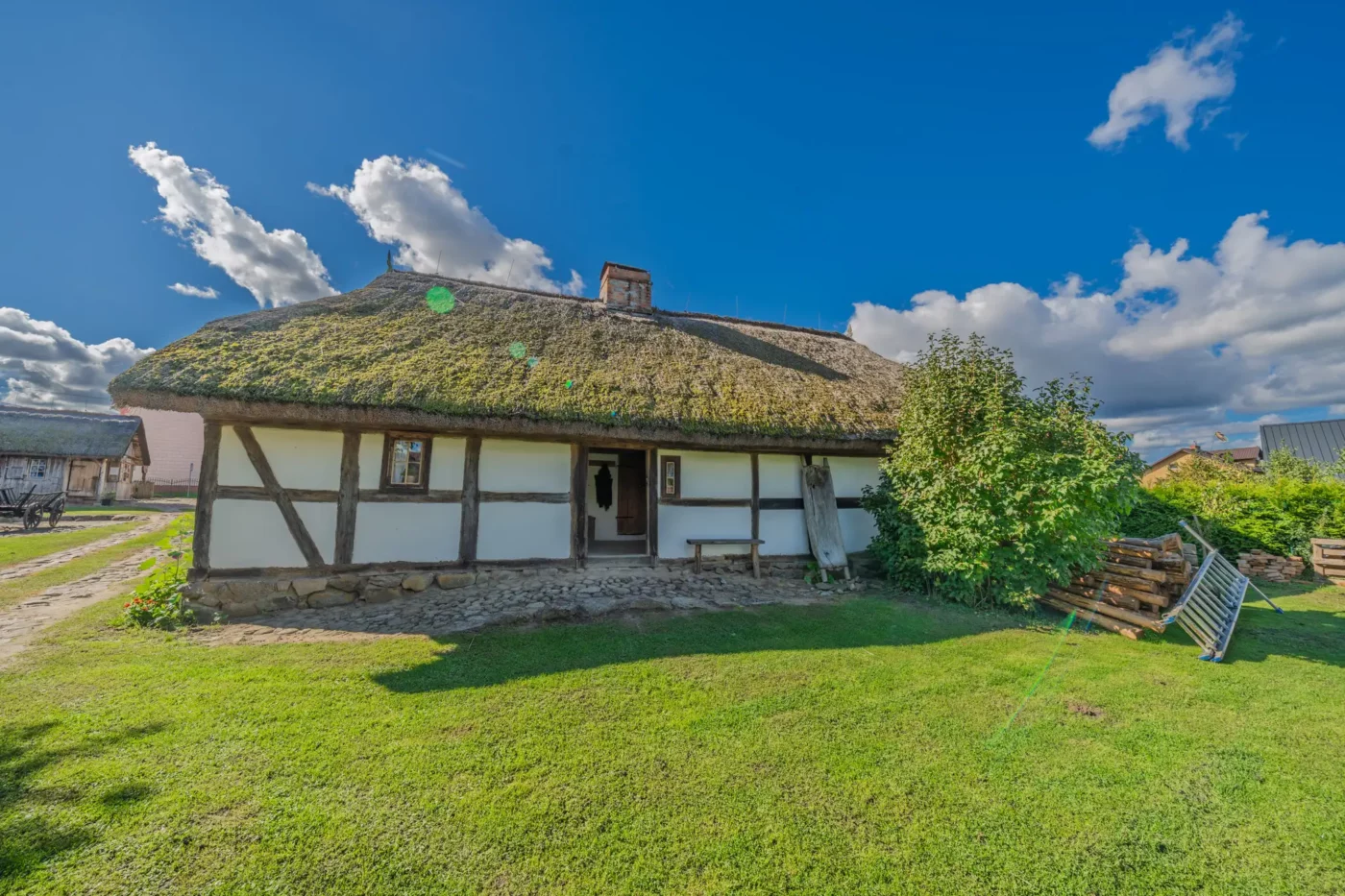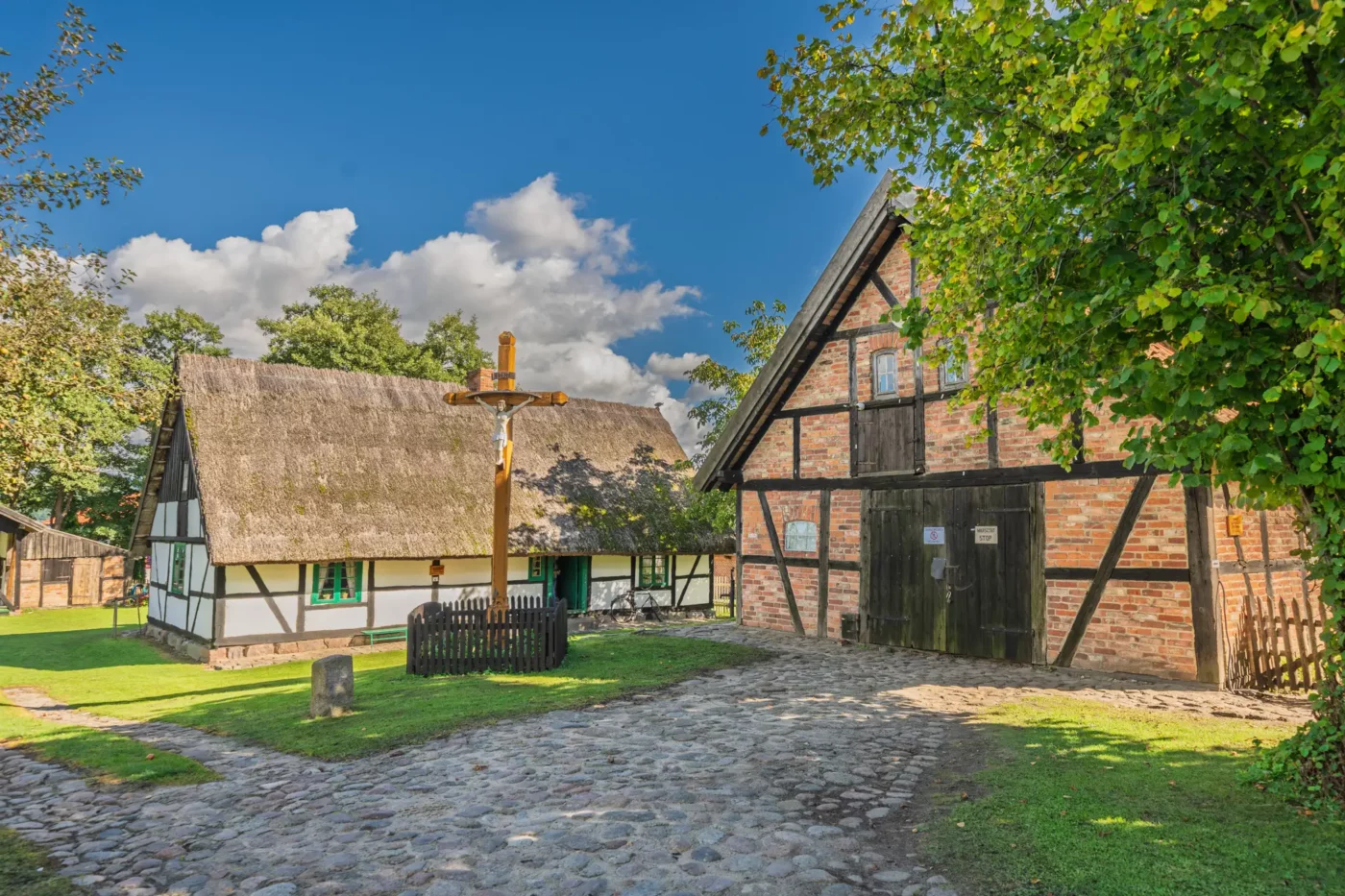Przekraczając próg tego skansenu, ma się wrażenie, że jego mieszkańcy wyszli tylko na chwilę. W sercu zagrody stoi checz – solidny, tradycyjny dom zamożnego kaszubskiego gospodarza. To tutaj biło serce całego gospodarstwa. Wnętrze, z potężnym piecem chlebowym i prostymi, lecz solidnymi meblami, opowiada historię rodziny, pracy i wspólnoty. Wokół domu rozlokowano pozostałe zabudowania: oborę, stodołę pachnącą sianem, wozownię i kamienną piwniczkę. Pomiędzy nimi rozkwita ogród, pełen zapomnianych dziś ziół, kolorowych kwiatów i warzyw, które stanowiły podstawę codziennej diety.