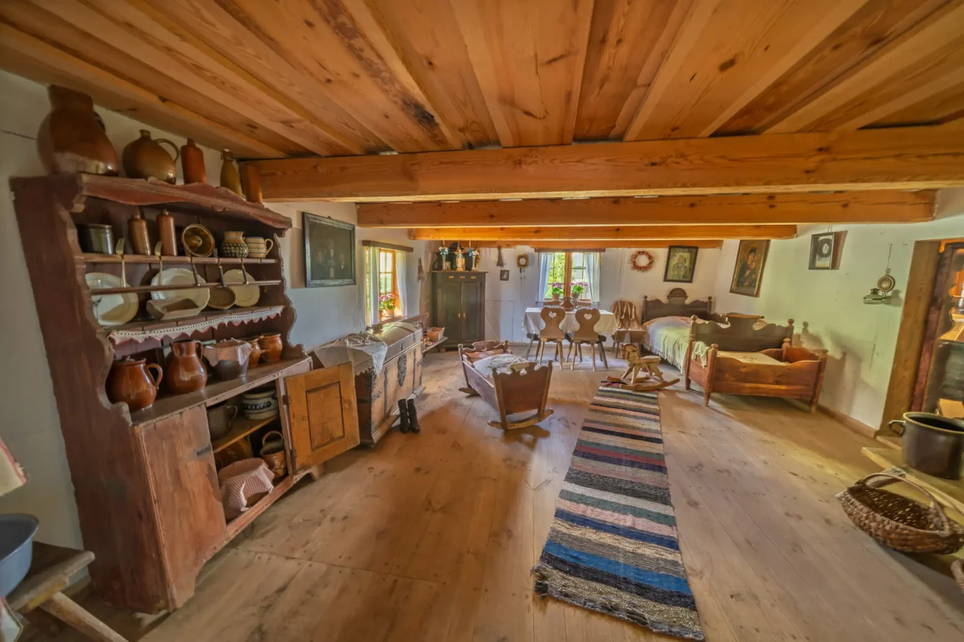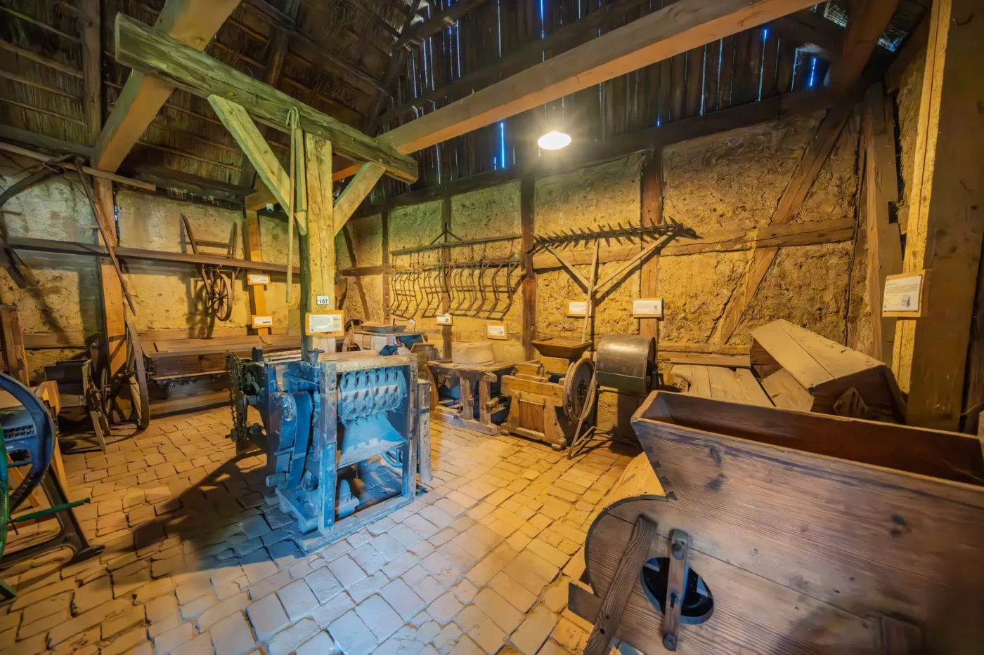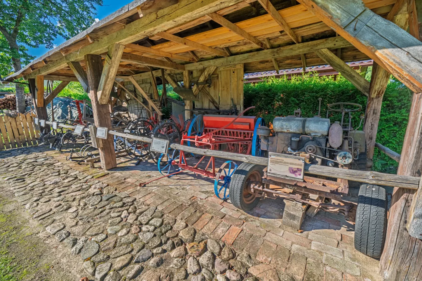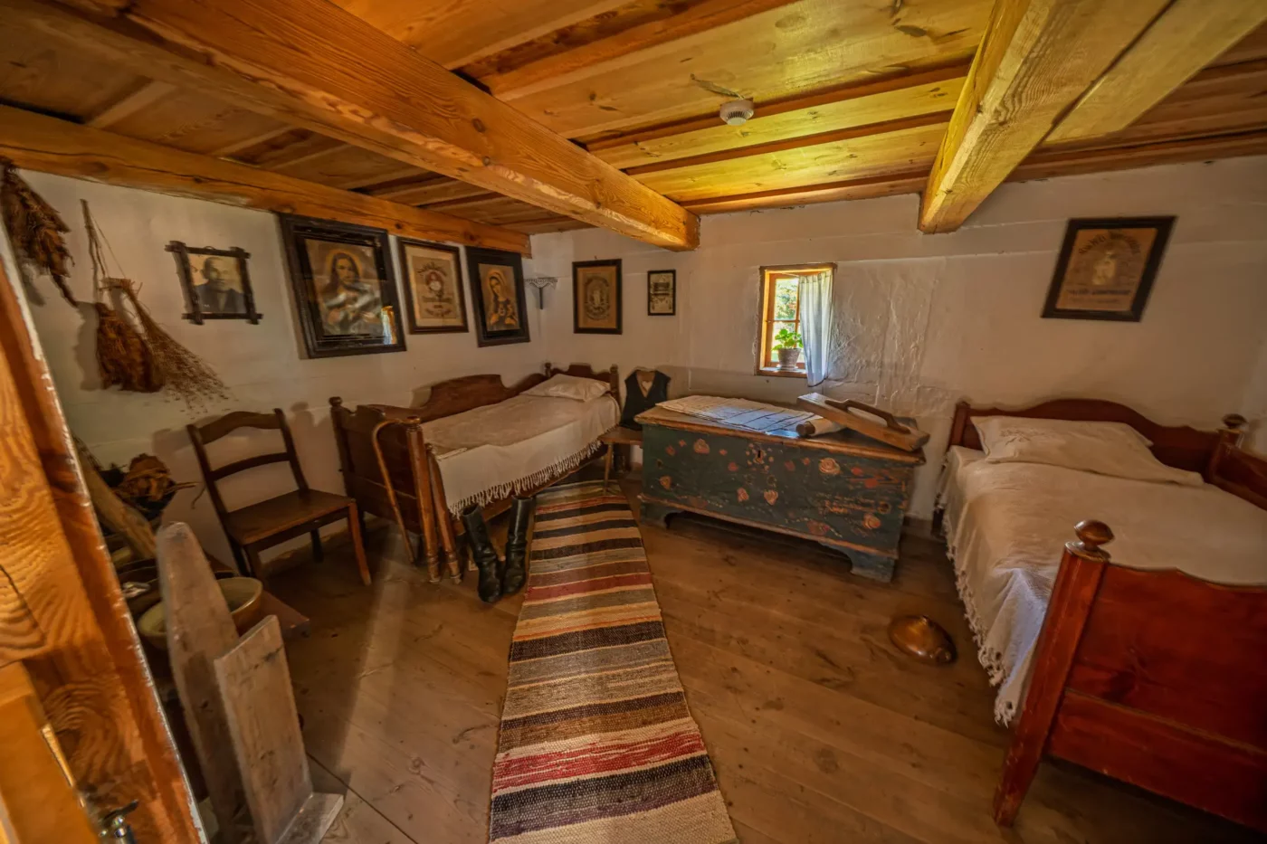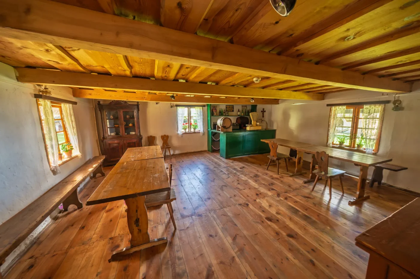 Przekraczając próg tego skansenu, ma się wrażenie, że jego mieszkańcy wyszli tylko na chwilę. W sercu zagrody stoi checz – solidny, tradycyjny dom zamożnego kaszubskiego gospodarza. To tutaj biło serce całego gospodarstwa. Wnętrze, z potężnym piecem chlebowym i prostymi, lecz solidnymi meblami, opowiada historię rodziny, pracy i wspólnoty. Wokół domu rozlokowano pozostałe zabudowania: oborę, stodołę pachnącą sianem, wozownię i kamienną piwniczkę. Pomiędzy nimi rozkwita ogród, pełen zapomnianych dziś ziół, kolorowych kwiatów i warzyw, które stanowiły podstawę codziennej diety.
