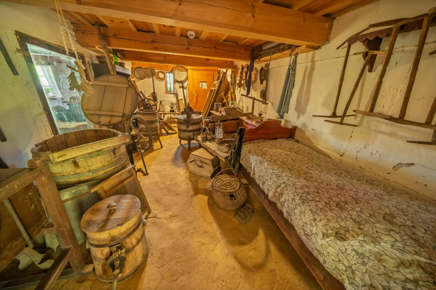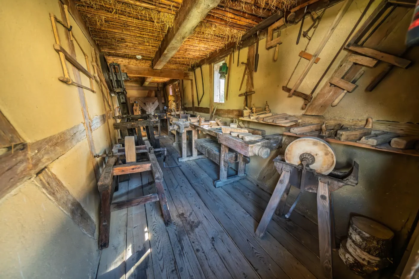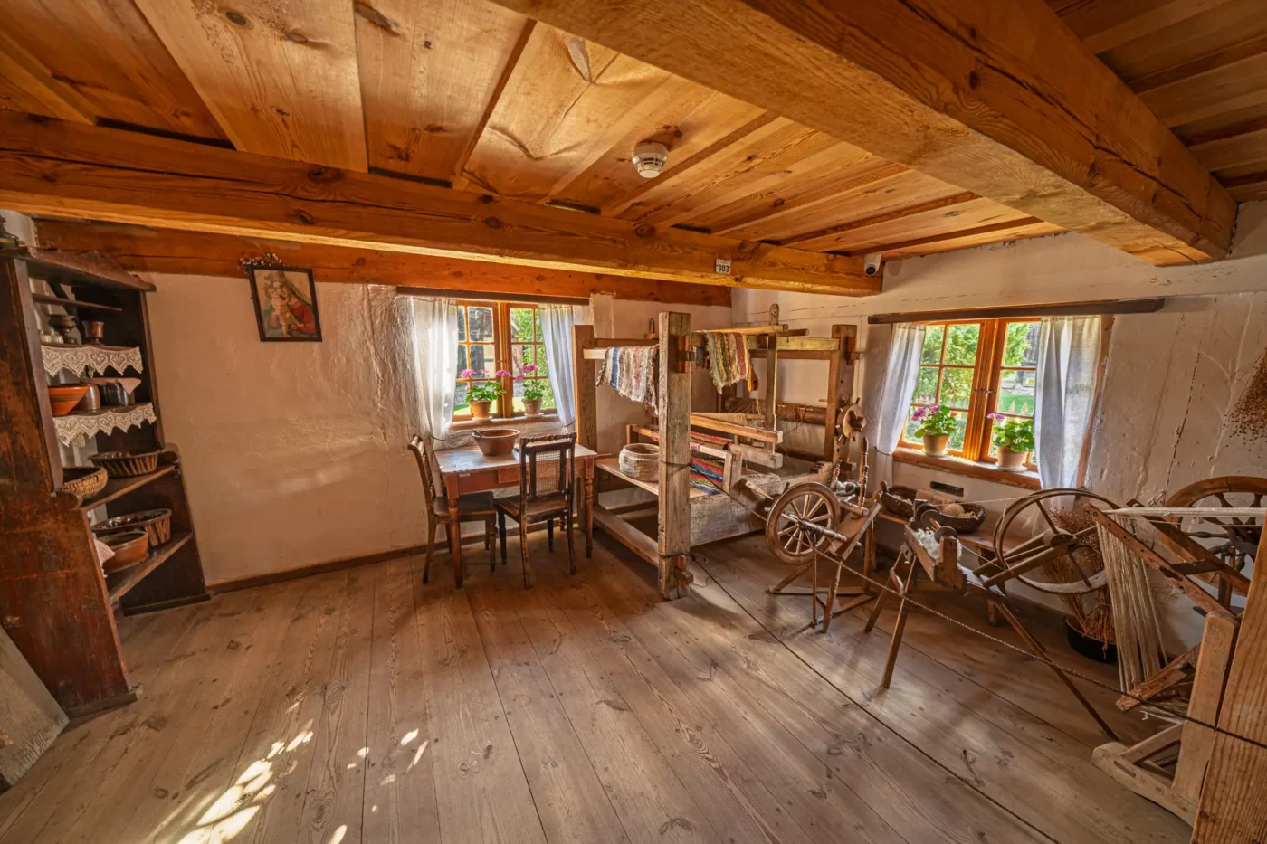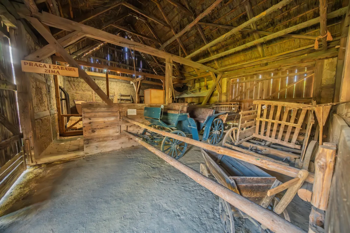 Jednak życie nad jeziorem miało dwa oblicza. Wystarczy przejść kilka kroków, by odkryć drugą część tej opowieści – świat kaszubskich rybaków. Skromniejsza chata, sieciarnia wypełniona narzędziami do naprawy sieci i sprzęt do połowu ryb to milczący świadkowie codziennej, ciężkiej walki z wodnym żywiołem. Każdy detal, od starannie zwiniętych lin po drewniane łodzie, opowiada o determinacji i głębokim szacunku do natury, która była jednocześnie żywicielką i potężnym przeciwnikiem.
