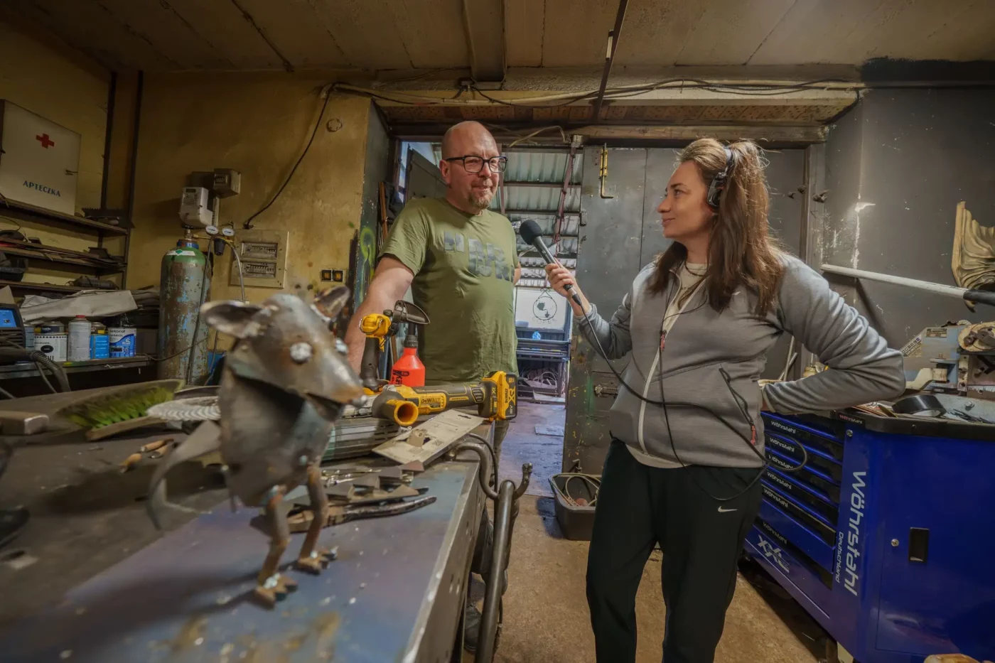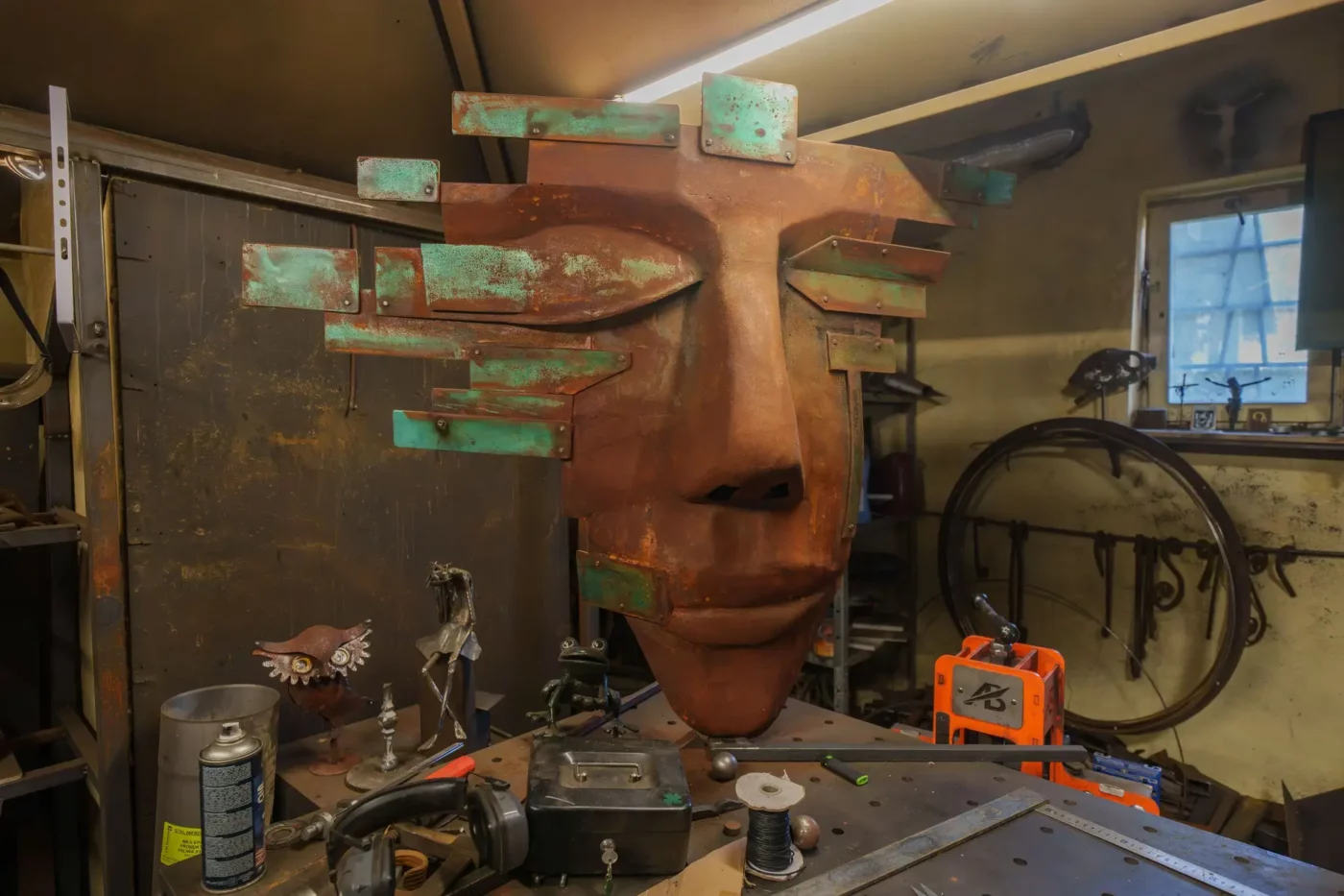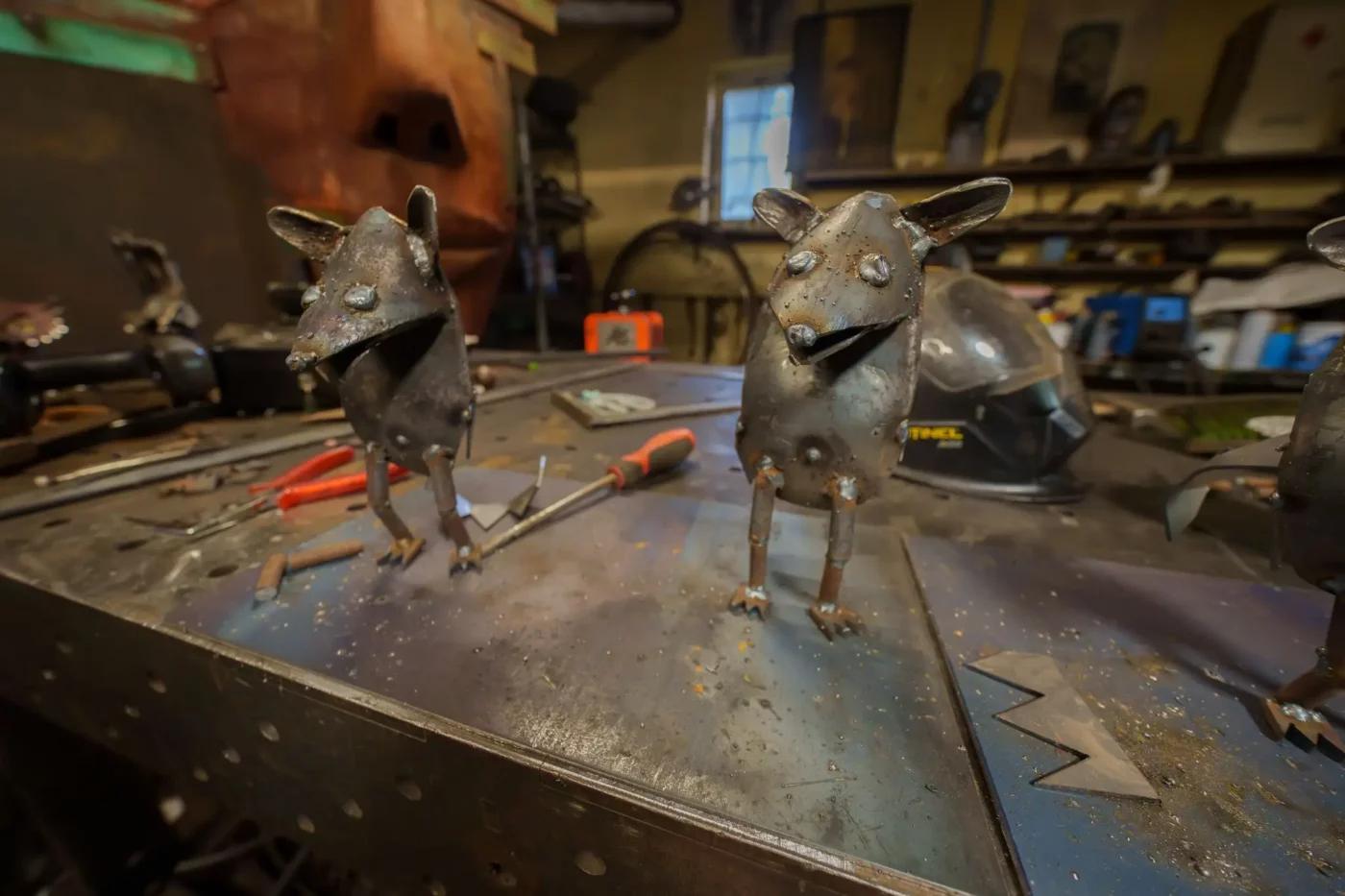 Pierwsze, co rzuca się w oczy, to niezwykłe istoty strzegące wejścia. Fantastyczne stwory, surrealistyczne pojazdy i postacie jakby wyjęte z postapokaliptycznej baśni. To nie jest typowa galeria sztuki z białymi ścianami i cichą atmosferą kontemplacji. To warsztat alchemika, gdzie chaos narzędzi, zapach spawanej stali i dźwięk metalu spotykają się z niezwykłą precyzją i artystyczną wizją.