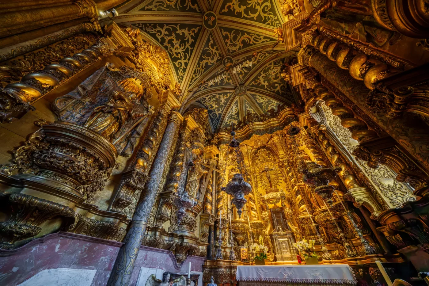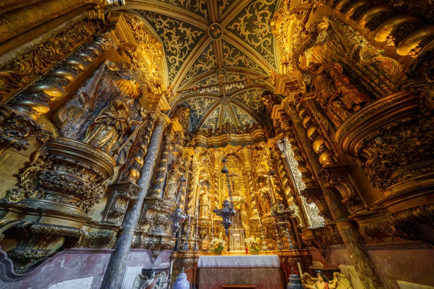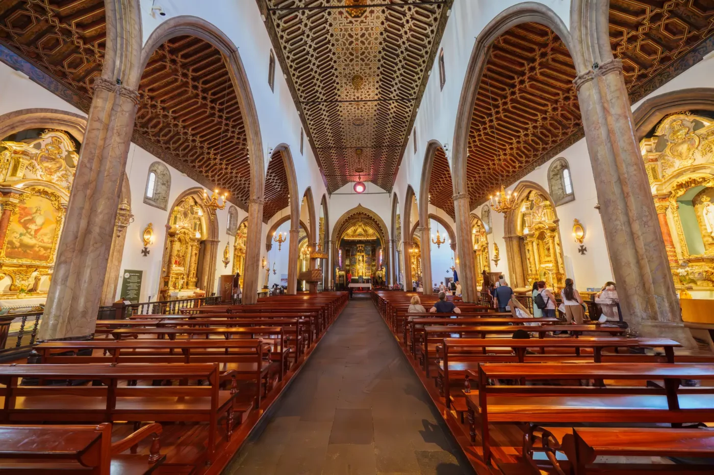 Prawdziwym arcydziełem i dumą świątyni jest jej monumentalny strop. Wykonany z lokalnego drewna cedrowego, stanowi jeden z najwspanialszych przykładów sufitu w stylu manuelińsko-mudejarskim w całej Portugalii. Spacerując główną nawą i zadzierając głowę do góry, można zatracić się w kontemplacji misternych, geometrycznych wzorów, rzeźbionych detali i inkrustacji z kości słoniowej. To właśnie to sklepienie, przesycone duchem epoki, najpełniej oddaje bogactwo i artystyczny kunszt czasów króla Manuela I.