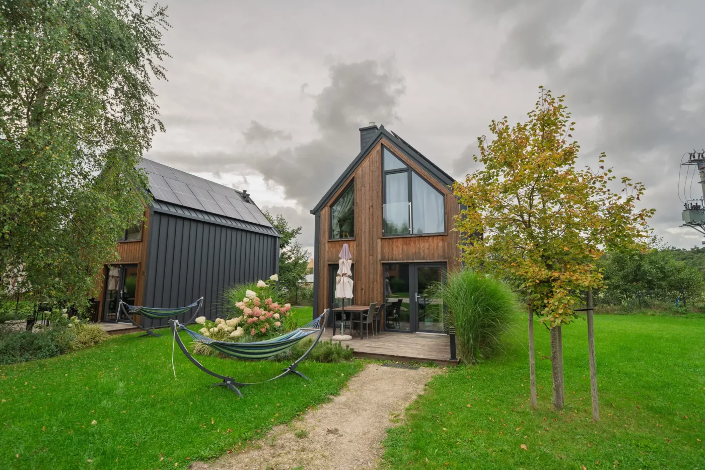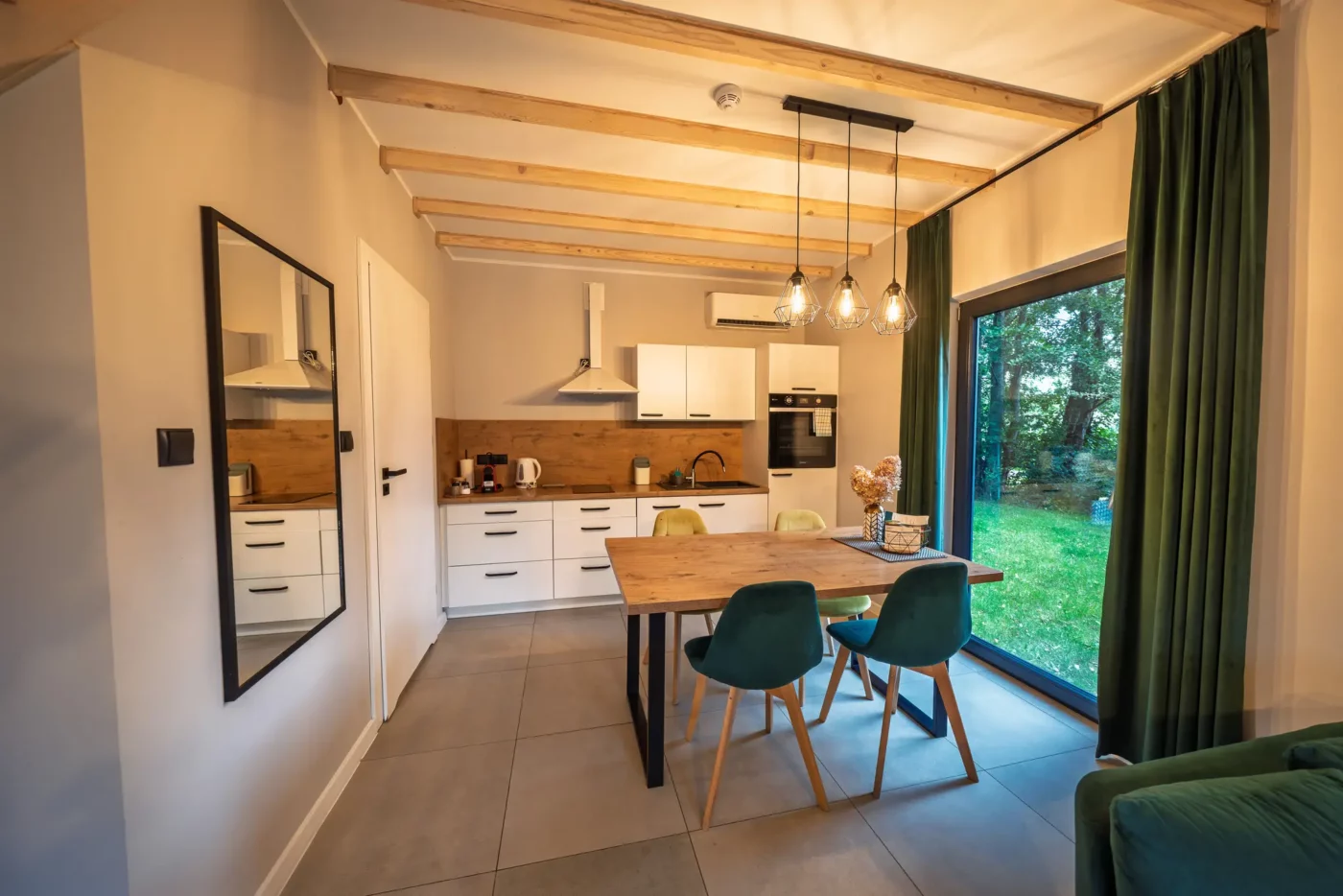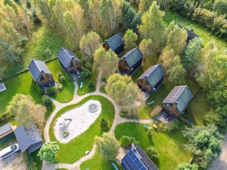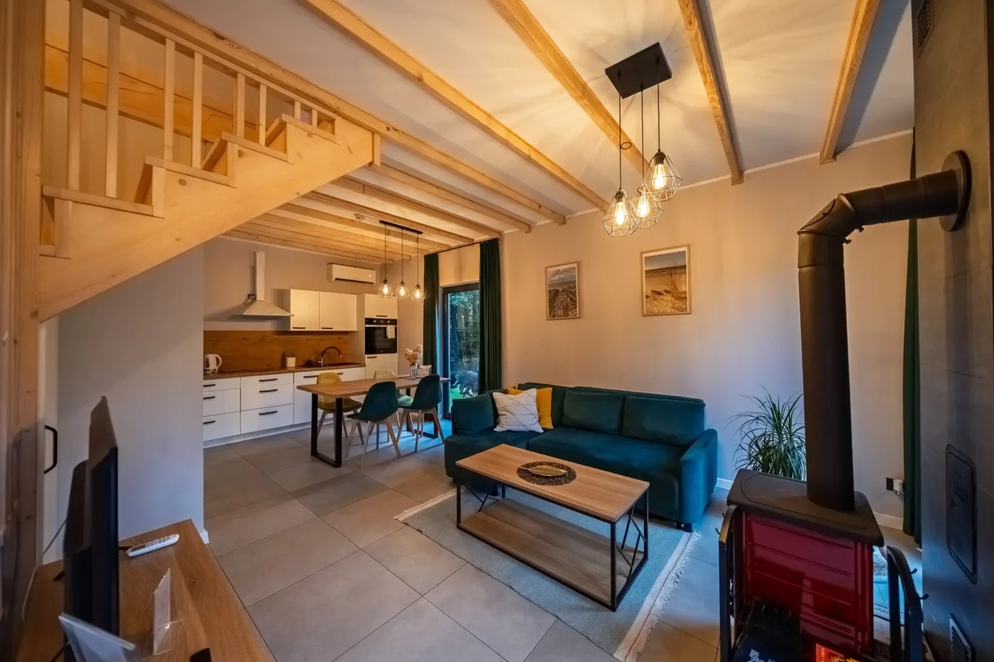 Każdy z domków komfortowo ugości do sześciu osób. To nie są ciasne kabiny, ale przemyślane przestrzenie, idealne, jeśli planujecie wyjazd w kameralnym gronie przyjaciół lub chcecie zabrać rodzinę w miejsce, gdzie dzieciaki będą miały bezpośredni kontakt z przyrodą.