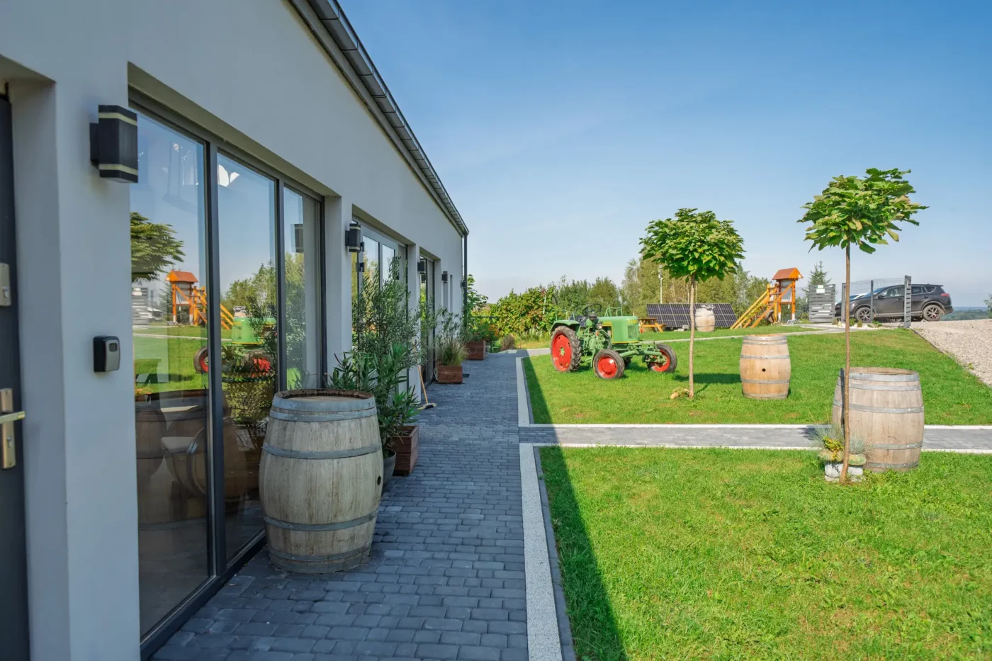 Do dyspozycji gości oddano tu komfortowe apartamenty oraz urokliwy, niezależny domek. Każde z tych miejsc zostało zaprojektowane tak, by zapewnić spokój i pełen relaks. To idealna baza wypadowa, ale też miejsce, z którego po prostu nie chce się wyjeżdżać. Możliwość spędzenia wieczoru na tarasie z kieliszkiem wina, patrząc na zachód słońca nad winnicą, to doświadczenie, którego nie da się opisać — trzeba je przeżyć.
