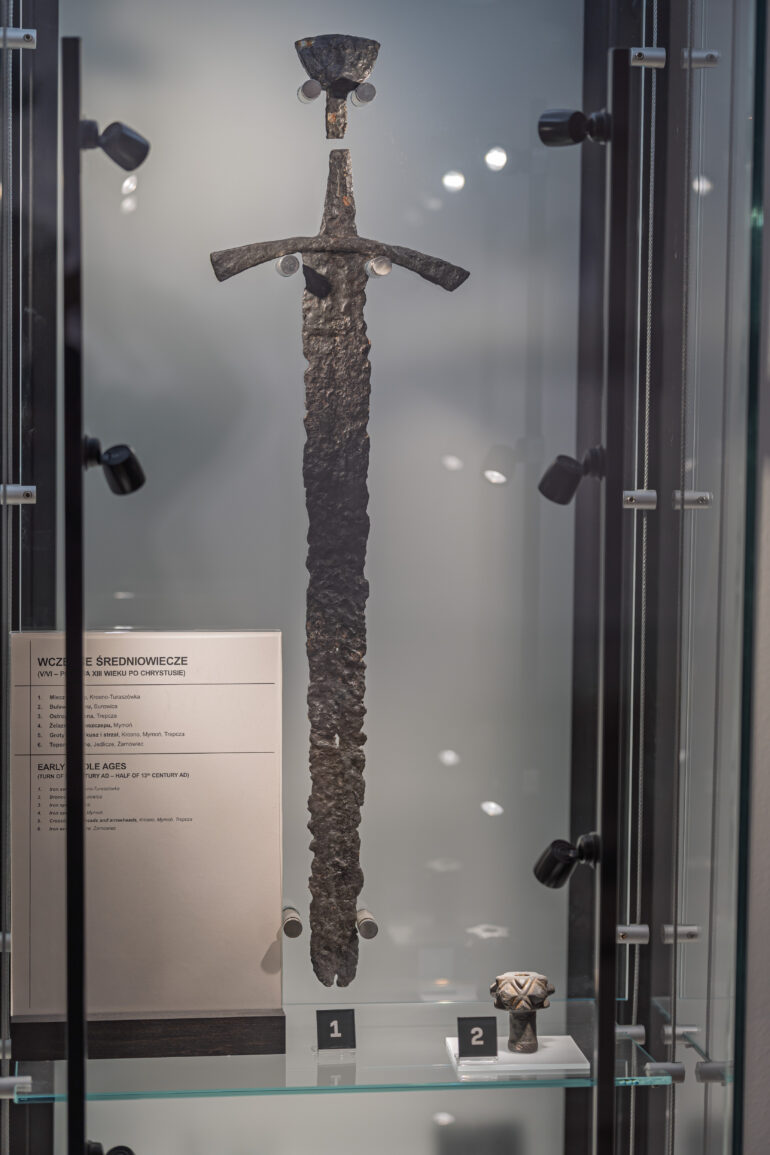Druga część wystawy to powrót do czasów bliższych nam historycznie, choć wciąż odległych. To moment, w którym archeologia spotyka się z architekturą miejską. W piwnicach wyeksponowano relikty średniowiecznego muru obronnego. To fizyczny dowód na znaczenie Krosna w czasach Kazimierza Wielkiego – miasta potężnego, ufortyfikowanego, tętniącego życiem handlowym. Znaleziska z prac wykopaliskowych prowadzonych na Rynku dopełniają ten obraz, pokazując codzienność mieszczan, zanim powstały nowoczesne traktaty i drogi.