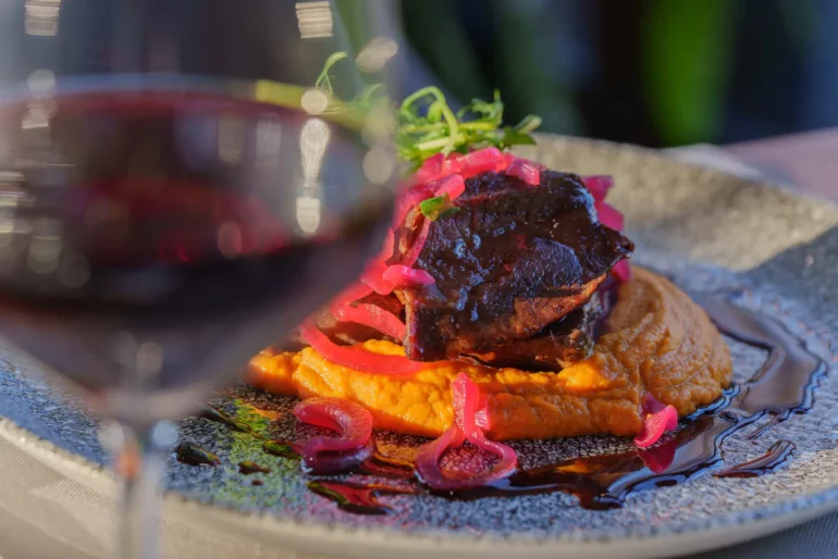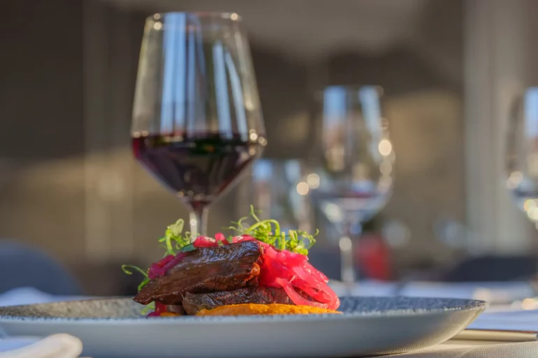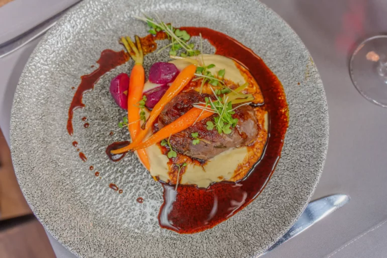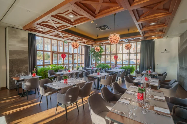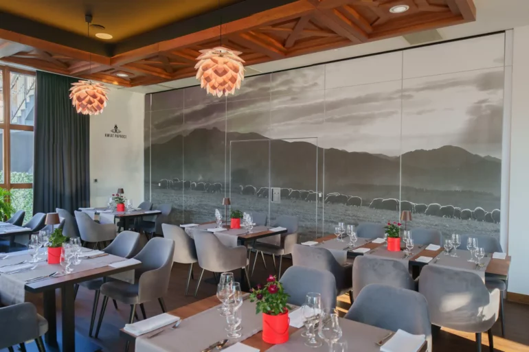 Menu restauracji bazuje na sezonowych, świeżych produktach pochodzących od zaufanych, regionalnych dostawców. Każde danie to kulinarna opowieść o Pieninach – od tradycyjnej kwaśnicy w nowoczesnej odsłonie, przez dania z pstrąga z lokalnych potoków, po desery z wykorzystaniem leśnych owoców. Starannie wyselekcjonowana karta win stanowi doskonałe uzupełnienie serwowanych potraw, a eleganckie wnętrze i profesjonalna obsługa sprawiają, że każda kolacja staje się wyjątkowym wydarzeniem.