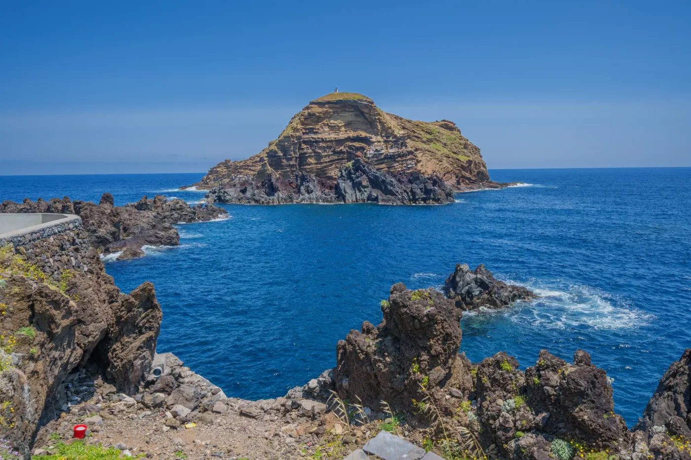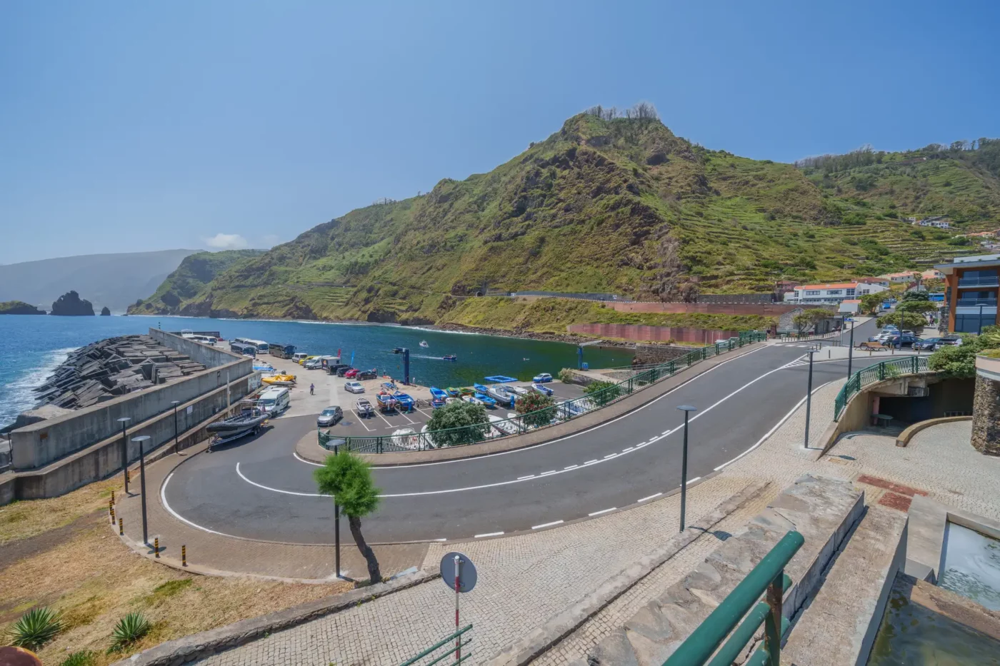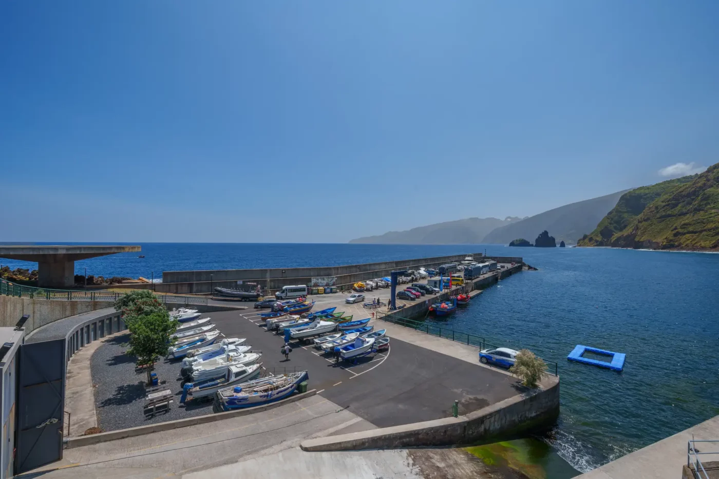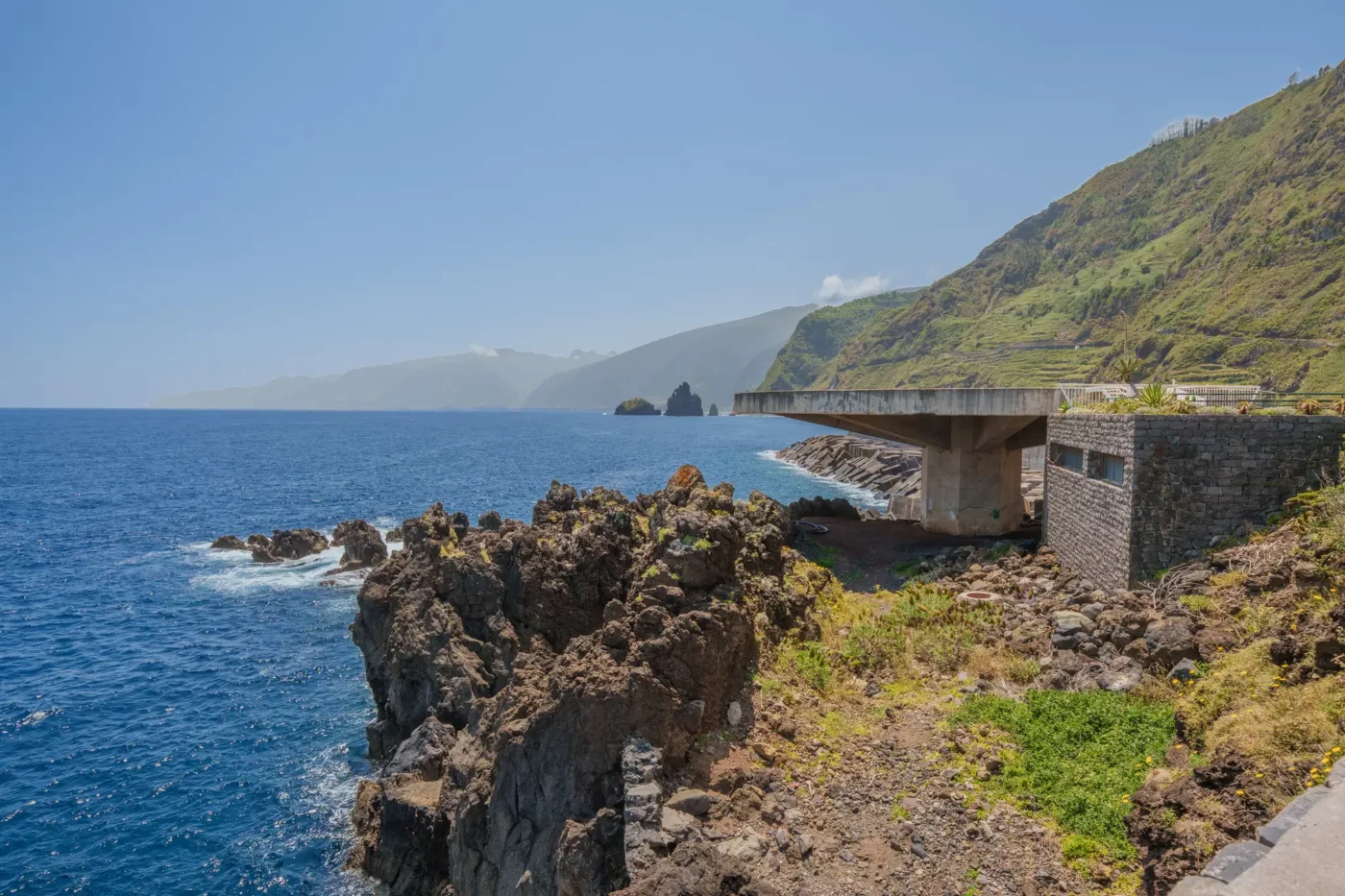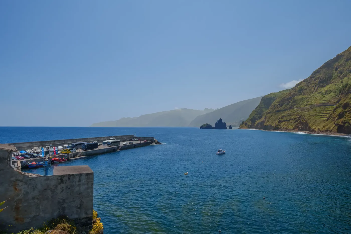 Jednakże kulminacją tego dnia, wizualnym podsumowaniem potęgi północnego wybrzeża, była wizyta na punkcie widokowym Miradouro da Ribeira da Janela. Stojąc na krawędzi klifu, otworzył się przed nami widok, który dosłownie zapiera dech. Z turkusowej toni oceanu, niczym starożytni tytani, wyrastają dwie monumentalne formacje skalne, o które z furią rozbijają się białe grzywy fal. Majestatyczne, strome klify opadają pionowo do wody, a w oddali widać zarys dzikiego wybrzeża, ginący gdzieś na horyzoncie. To panorama, która uświadamia człowiekowi jego małość wobec sił natury. Staliśmy tam w milczeniu, próbując zapisać ten obraz w pamięci – obraz dzikiej, nieposkromionej i absolutnie pięknej Madery.