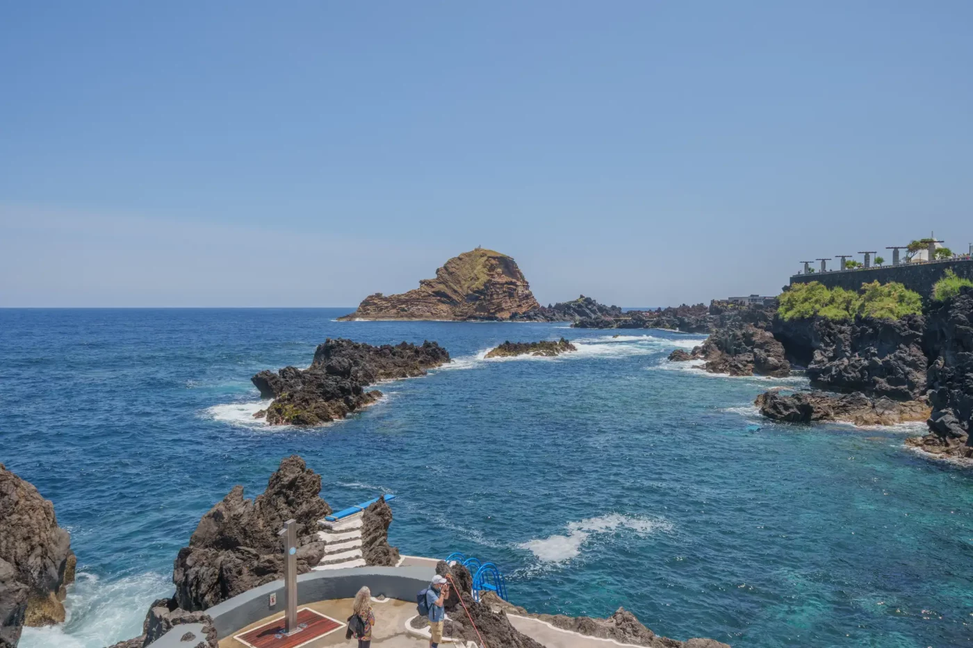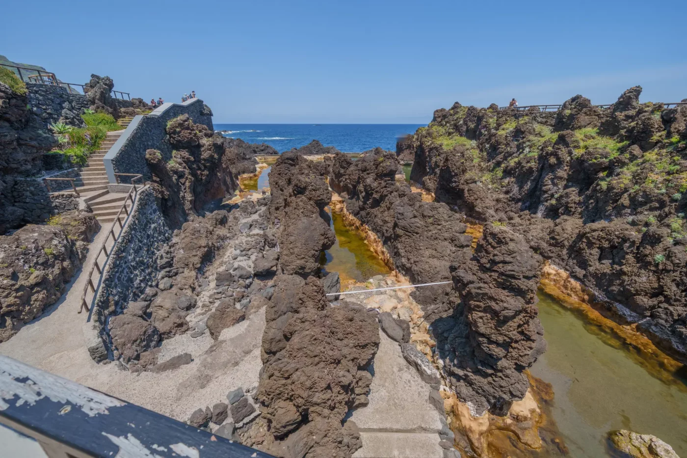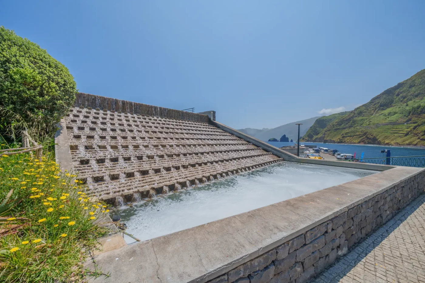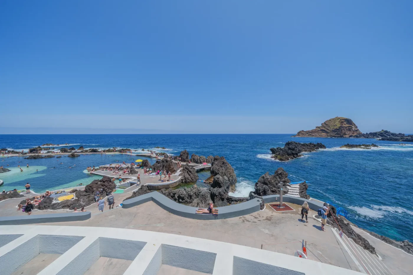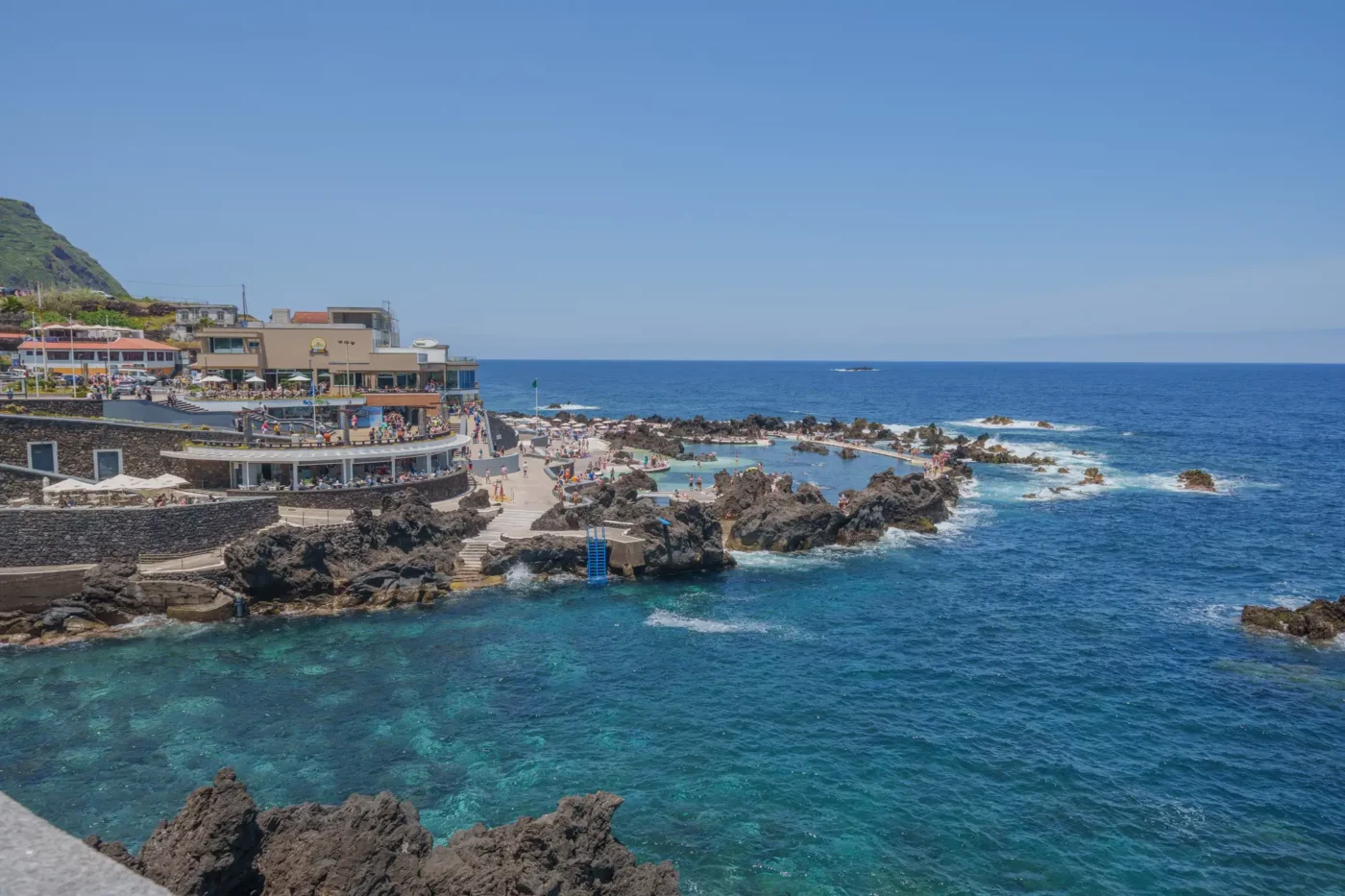 Odkryliśmy, że Porto Moniz oferuje dwa odrębne doświadczenia. Pierwsze to płatny, zorganizowany kompleks basenów, gdzie wulkaniczne bariery zostały wygładzone, a tarasy i schodki ułatwiają dostęp do krystalicznie czystej, oceanicznej wody. To idealne miejsce na relaksującą kąpiel, gdzie można bezpiecznie pływać, czując jednocześnie energię Atlantyku, którego fale z hukiem rozbijają się o zewnętrzne mury.