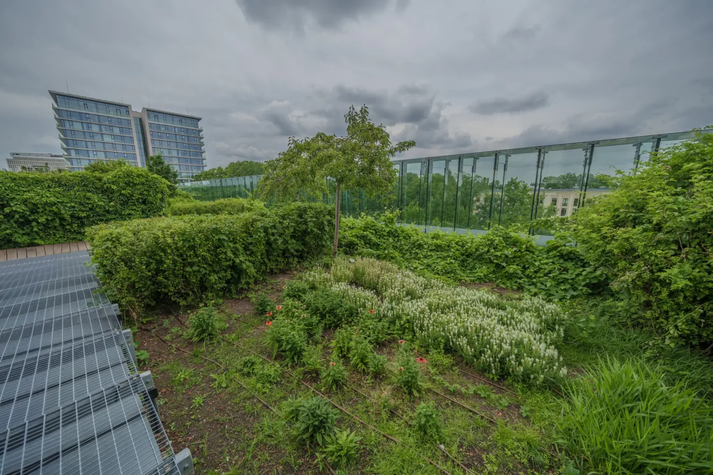 Wystarczy wjechać windą, by przenieść się do zupełnie innego świata. Na czwartym piętrze, na rozległej połaci dachu, projektanci stworzyli starannie zaaranżowany ogród. Znajdziemy tu drzewa i liczne krzewy, które tworzą atmosferę zacisznego parku zawieszonego nad miastem. Pośród alejek i zadbanej roślinności kryje się jeszcze jeden sekret – miejska pasieka. Ule pozwalają dyskretnie podglądać życie pszczół, które stały się symbolem tego, jak natura może z powodzeniem odnaleźć swoje miejsce nawet w najbardziej zurbanizowanym otoczeniu.