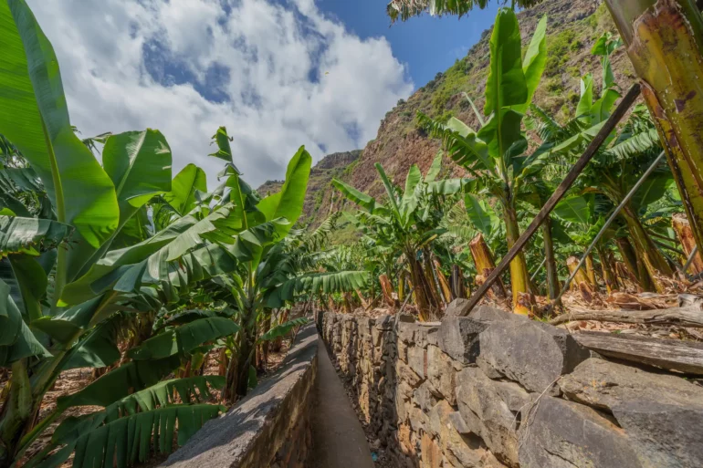Naszej wędrówce nieustannie towarzyszył cichy, kojący szmer. To dźwięk wody płynącej w lewadach – historycznych kanałach irygacyjnych, które są krwiobiegiem wyspy. Tutaj, na Rota da Banana, ich rola staje się krystalicznie czysta. To dzięki nim woda z deszczowej północy dociera na słoneczne południe, nawadniając te bujne plantacje i pozwalając na uprawę „ouro verde”, jak z dumą mówią o bananach mieszkańcy.