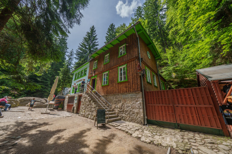 Tuż przy wodospadie, w historycznym budynku, mieści się niewielkie, klimatyczne schronisko PTTK „Kochanówka”. To idealne miejsce, by na chwilę usiąść i delektować się atmosferą. Kawa czy herbata z widokiem na spienioną wodę smakują tu absolutnie wyjątkowo. To także świetna okazja, by spróbować klasycznych schroniskowych dań, jak szarlotka czy pierogi.