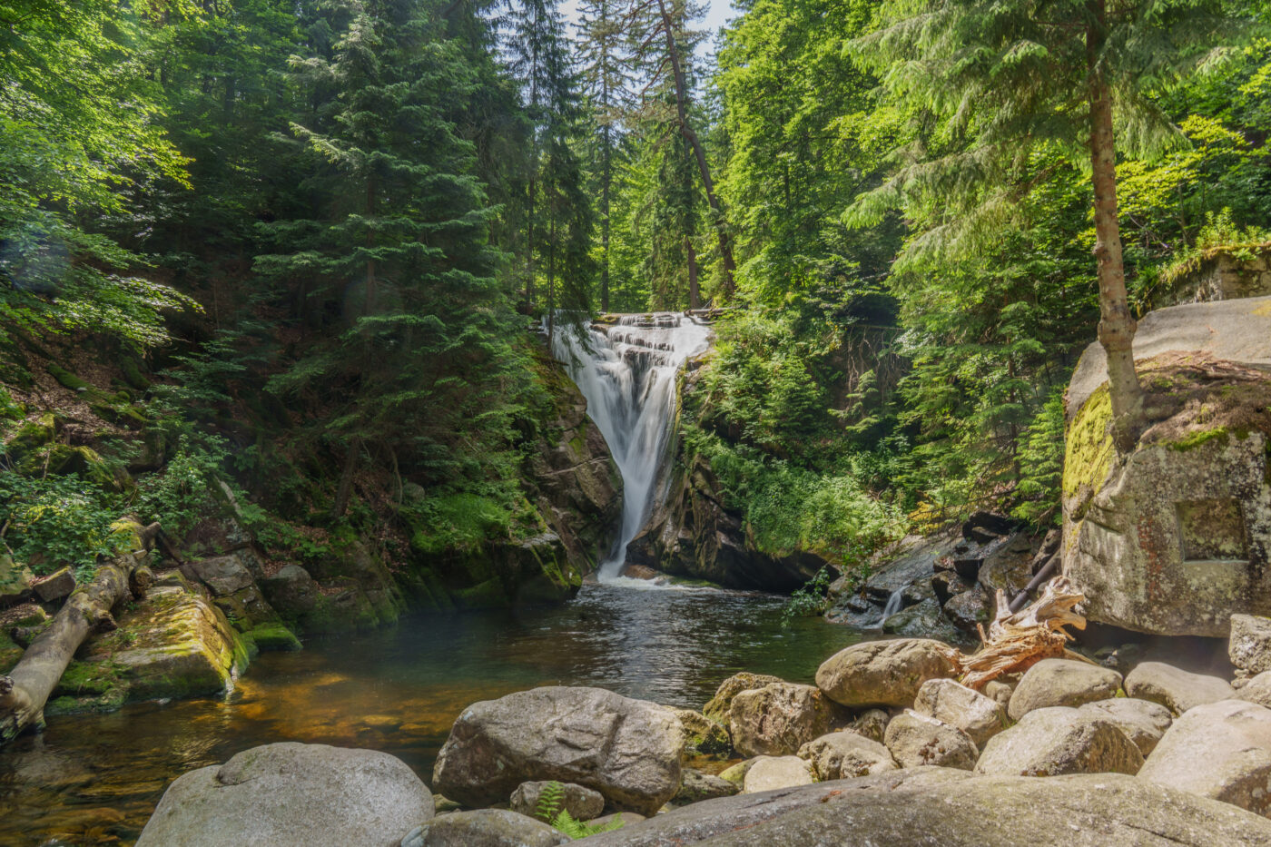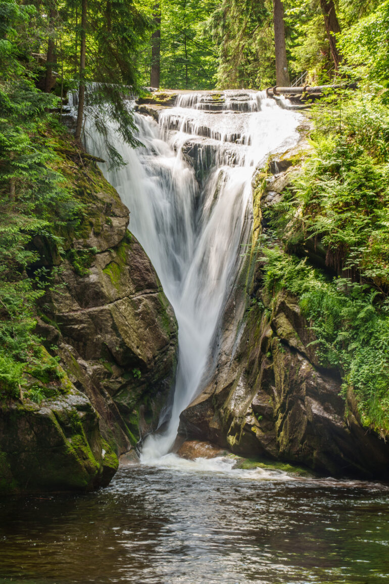 Gdy ścieżka się kończy, stajemy u wrót niewielkiego, skalnego kotła. To tutaj potok Szklarki, spływając z wysokości 13,3 metra, tworzy malowniczą, zwężającą się ku dołowi kaskadę. Woda z hukiem uderza o skały, rozpryskując wokół siebie orzeźwiającą mgiełkę. To nie jest najwyższy wodospad w Karkonoszach – ten tytuł należy do Wodospadu Kamieńczyka – ale jego urok tkwi w intymnej atmosferze.