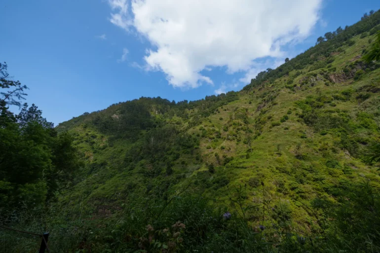 Po dotarciu do punktu, w którym obie lewady niemal się spotykają, rozpoczynamy powrót nowszą i zdecydowanie bardziej spektakularną trasą – Levada Nova. Kontrast jest natychmiastowy. Wąska, leśna ścieżka ustępuje miejsca szerokim, otwartym perspektywom. To tutaj natura pokazuje swoją potęgę i rozmach.