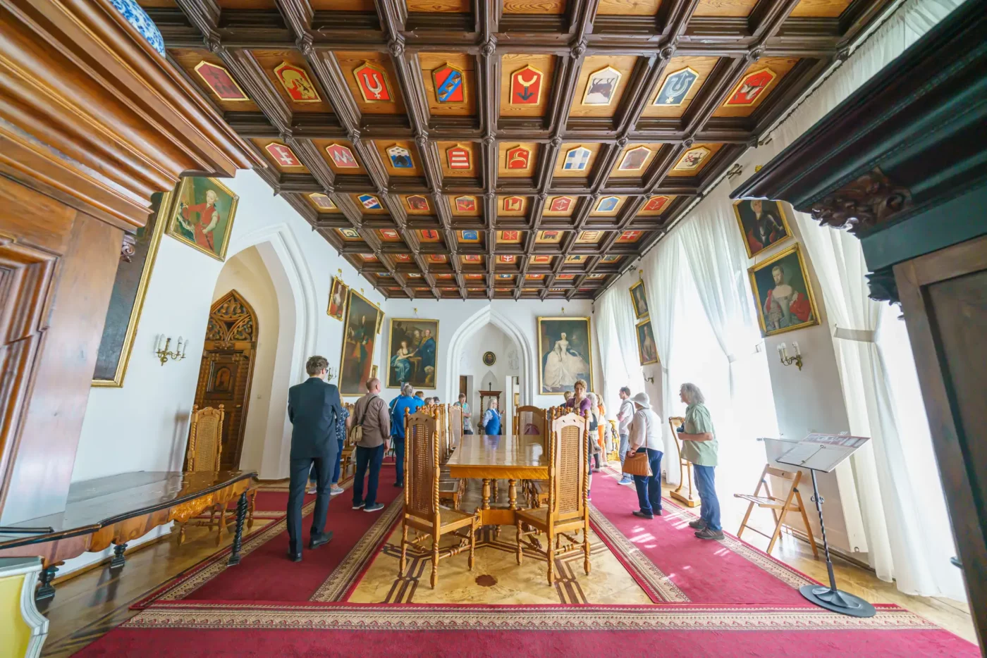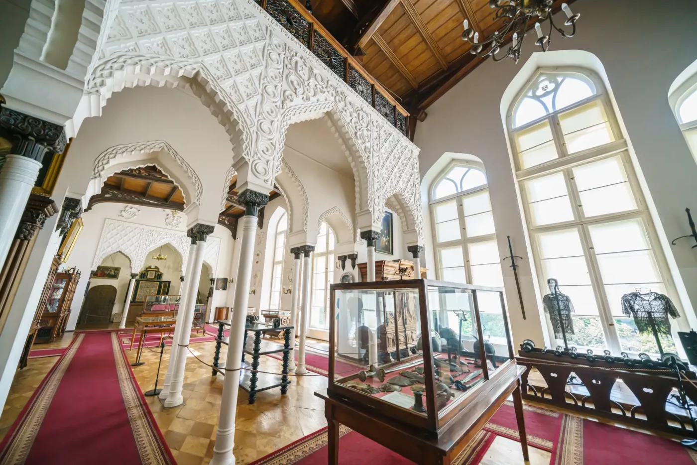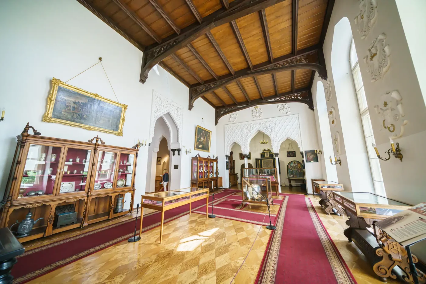 - Sala Mauretańska: To najbardziej reprezentacyjne i unikatowe pomieszczenie w zamku. Inspirowana architekturą Alhambry w Grenadzie, zachwyca misternymi sztukateriami, bogactwem detali i orientalnym klimatem. W jej wnętrzu prezentowana jest kolekcja pamiątek narodowych oraz dzieł sztuki.